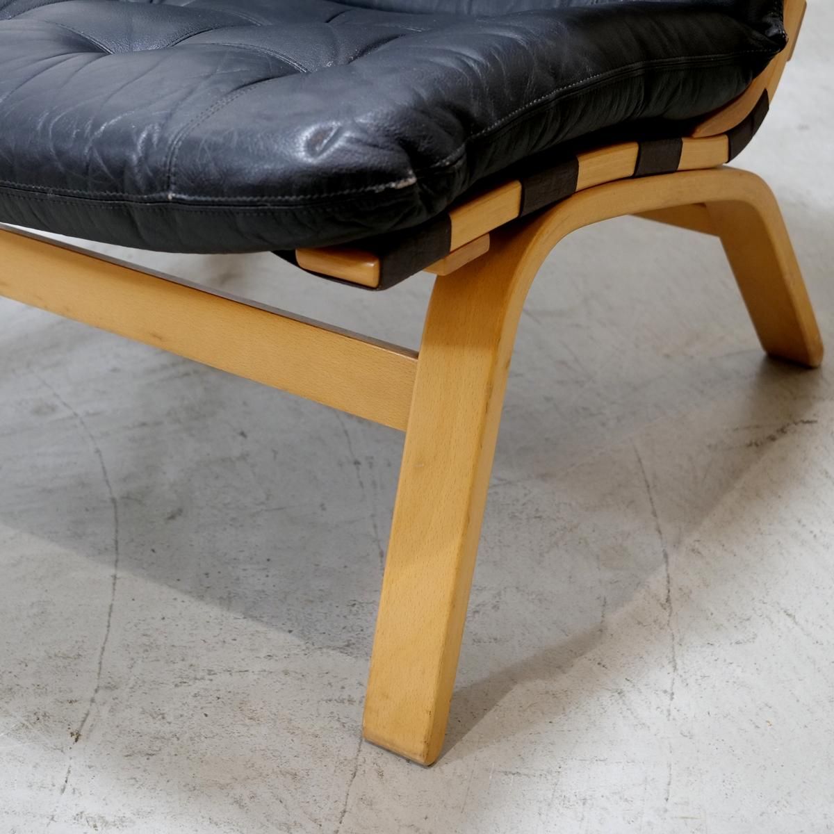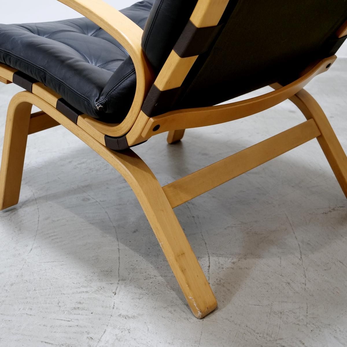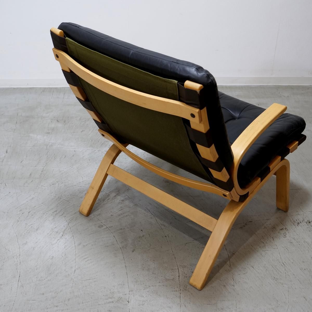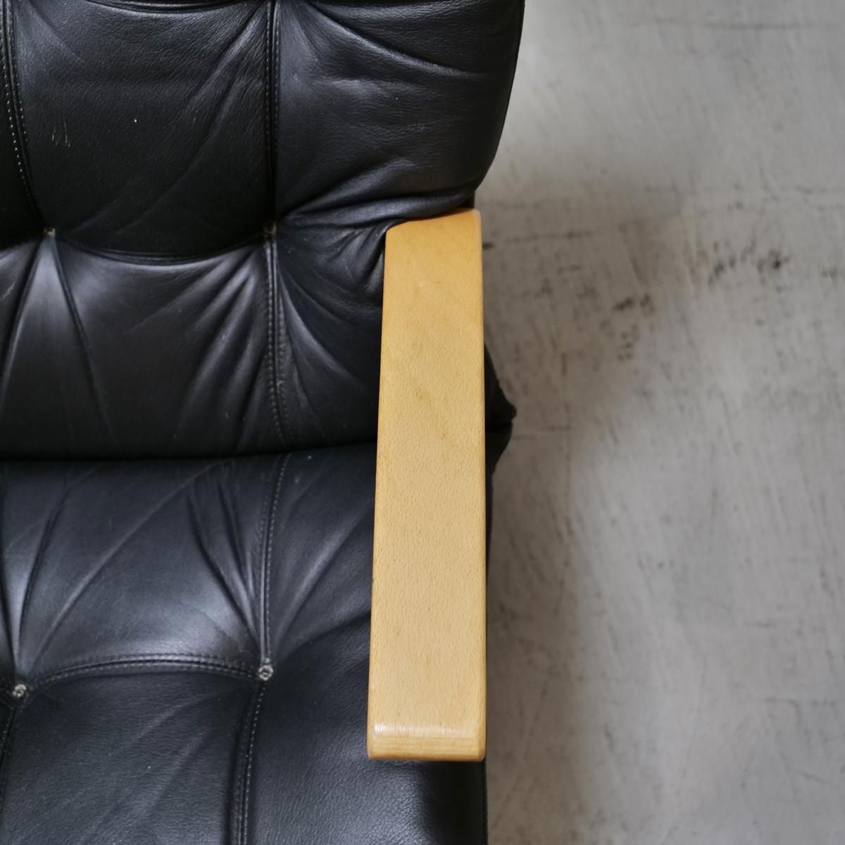 こちらは、薄くスライスされた木材を何層にも重ね合わせ圧着させる「成形合板(プライウッド)」のフレームをベースにブラック色の合皮レザークッションの組み合わせ。ブナ材のプライウッドはバネの役割も担っており、しなやかで丈夫という利点があり、スッキリしたデザインに仕上がるため北欧の椅子に多く見られています。