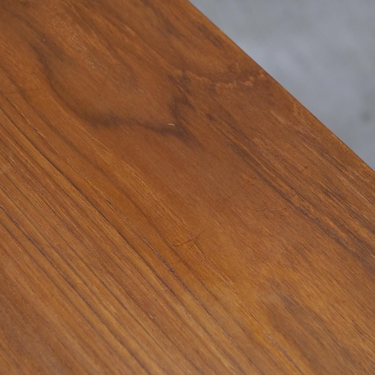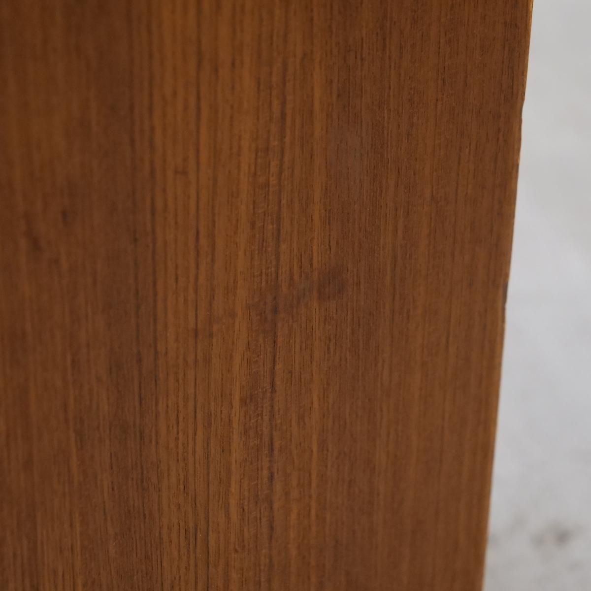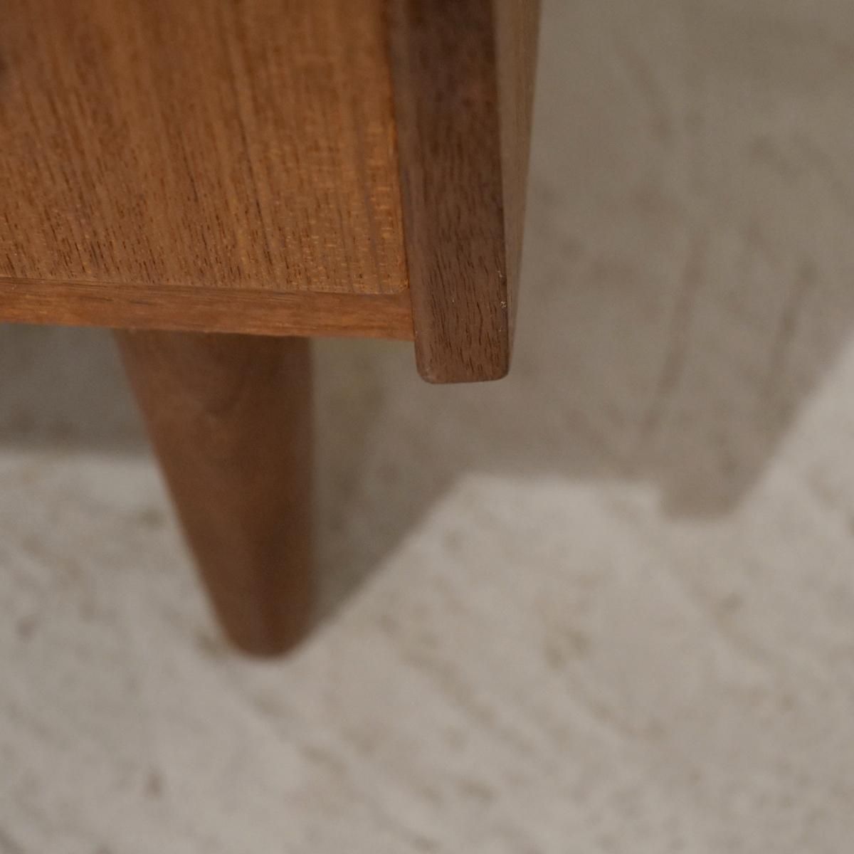 経年変化したチーク材で構成され、天板や前板は木の風合いが強く伝わる板目(年輪が見える)を左右対称に張り合わせており、側面は柾目(縦の木目)と贅沢にも木目を選んでいる。そして天板の縁は内側に少し斜めにエッジが付けられ、側面の前方の縁には外側に少し斜めにエッジが付けられています。