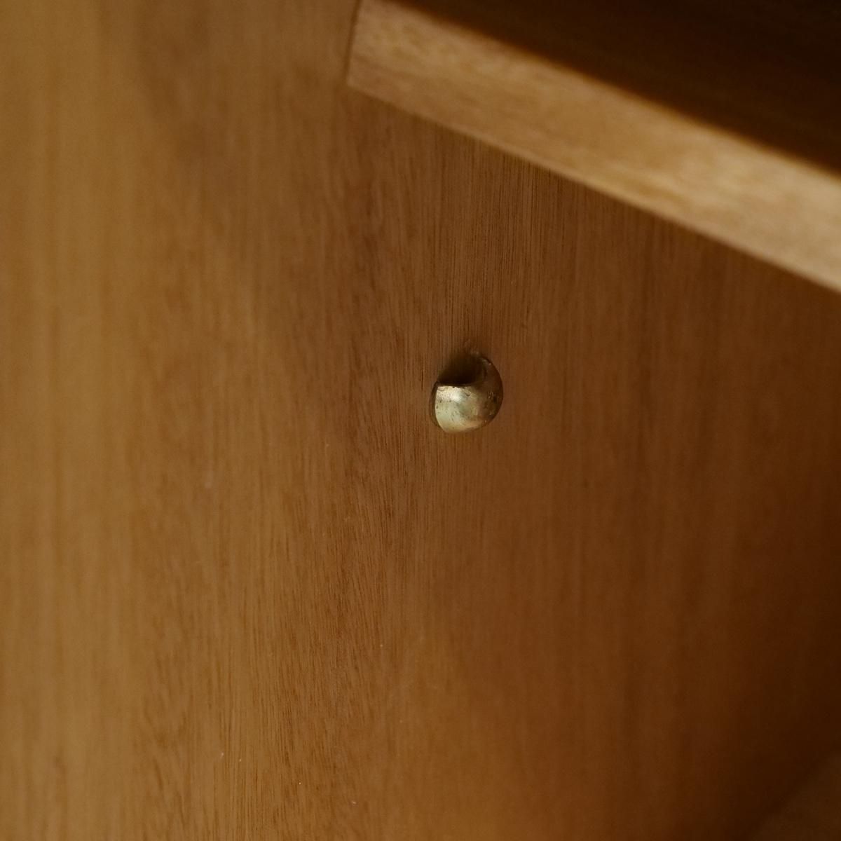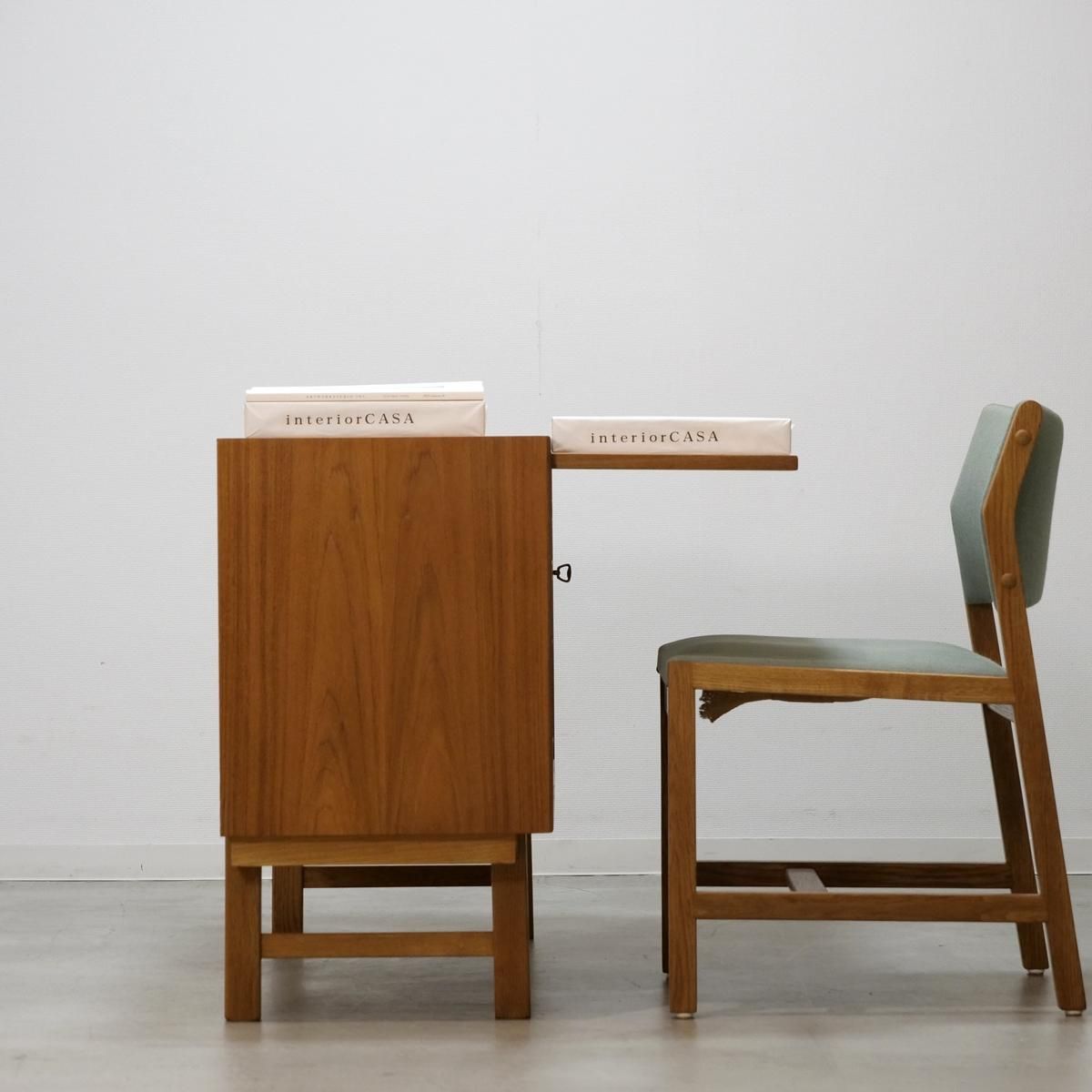 元は食器棚として作られたと想定され、スライド天板を引くと、軽いモノを載せたり、書き物をしたりすることができます。引出は上2段は浅め、下2段は深めで収納分けできます。扉を開くと高さ調整はできないが、棚板1枚付属され、リビングで散らかりがちな小物から大物までの収納がしっかりでき、収納力が魅力的なサイドボードをリビングダイニングや寝室にいかがでしょうか。