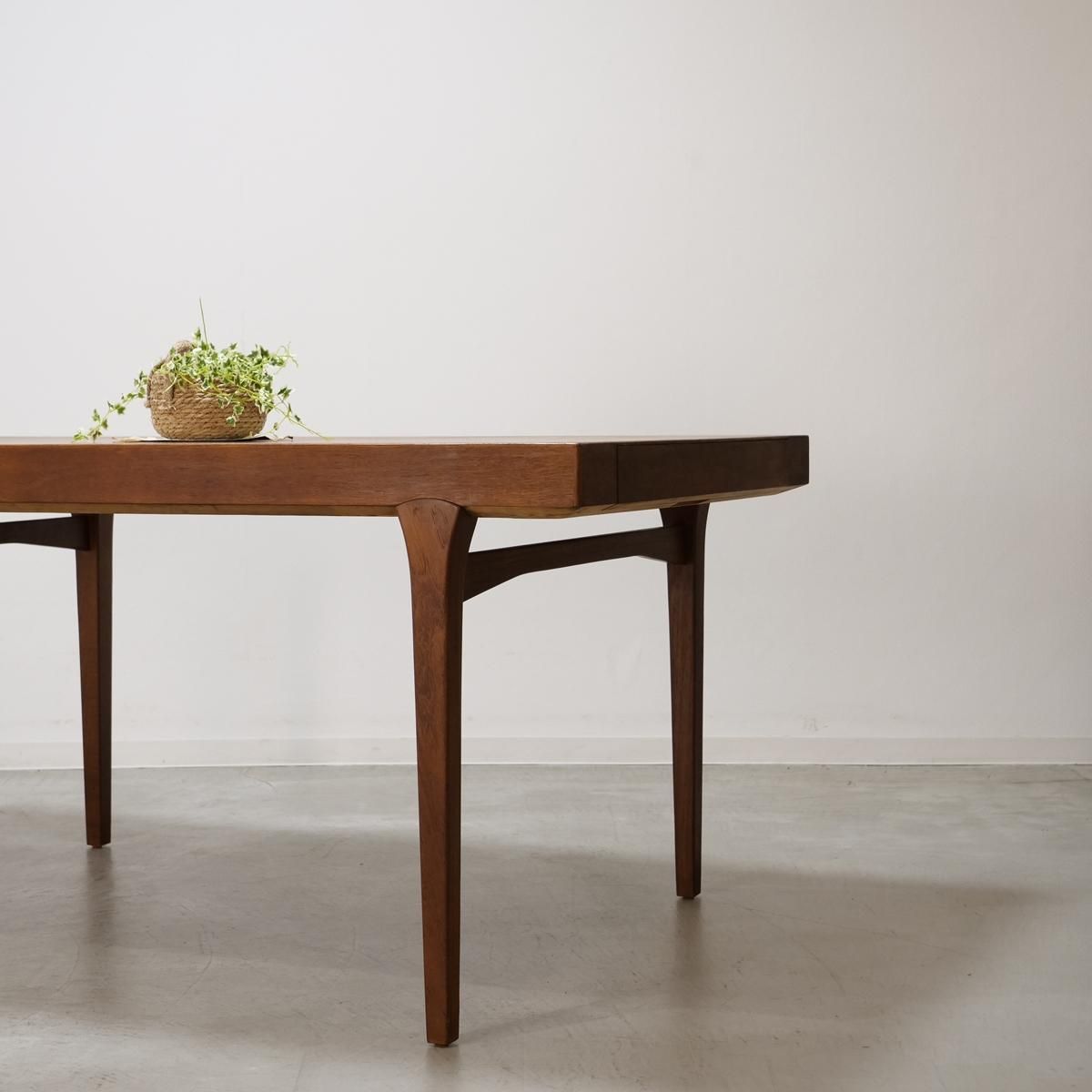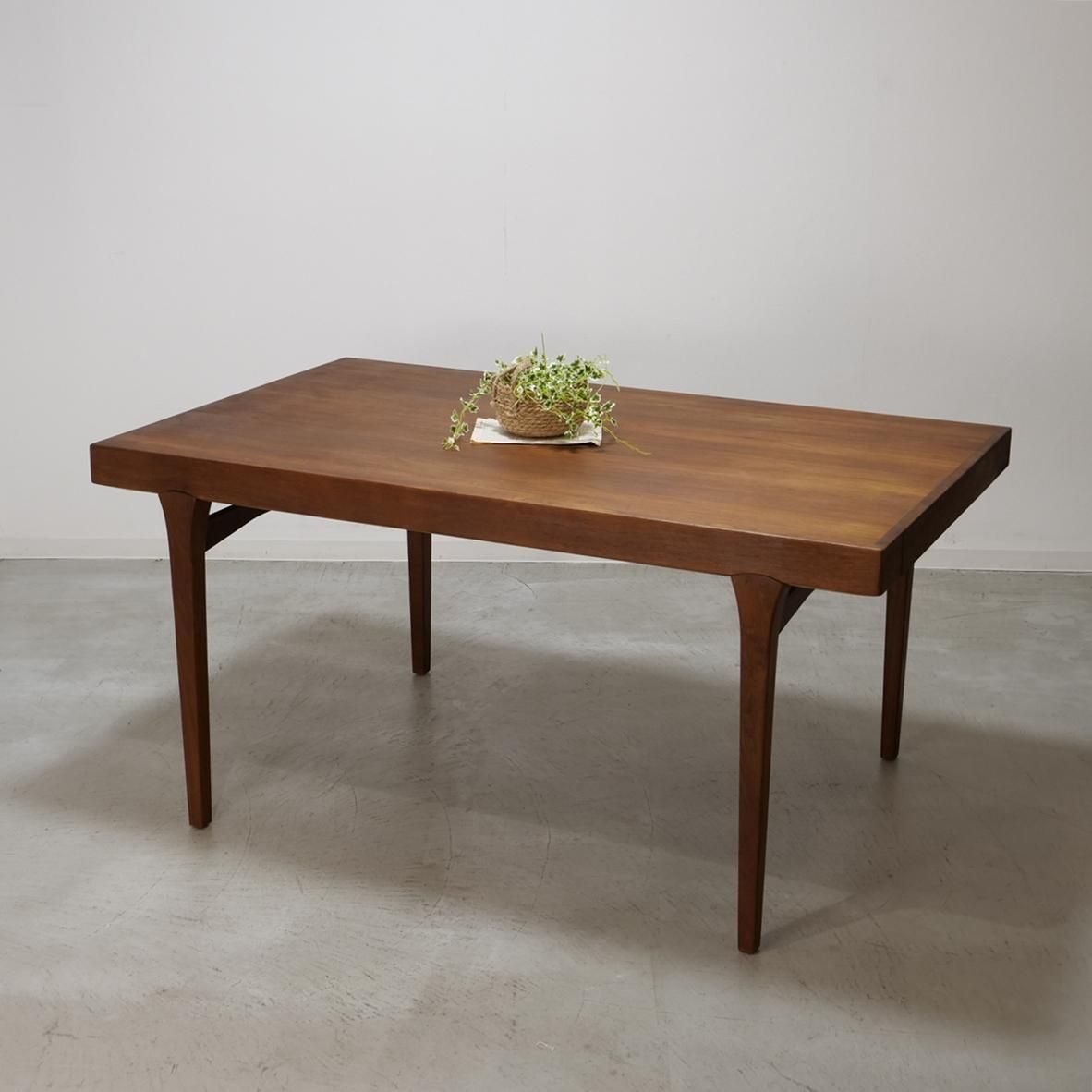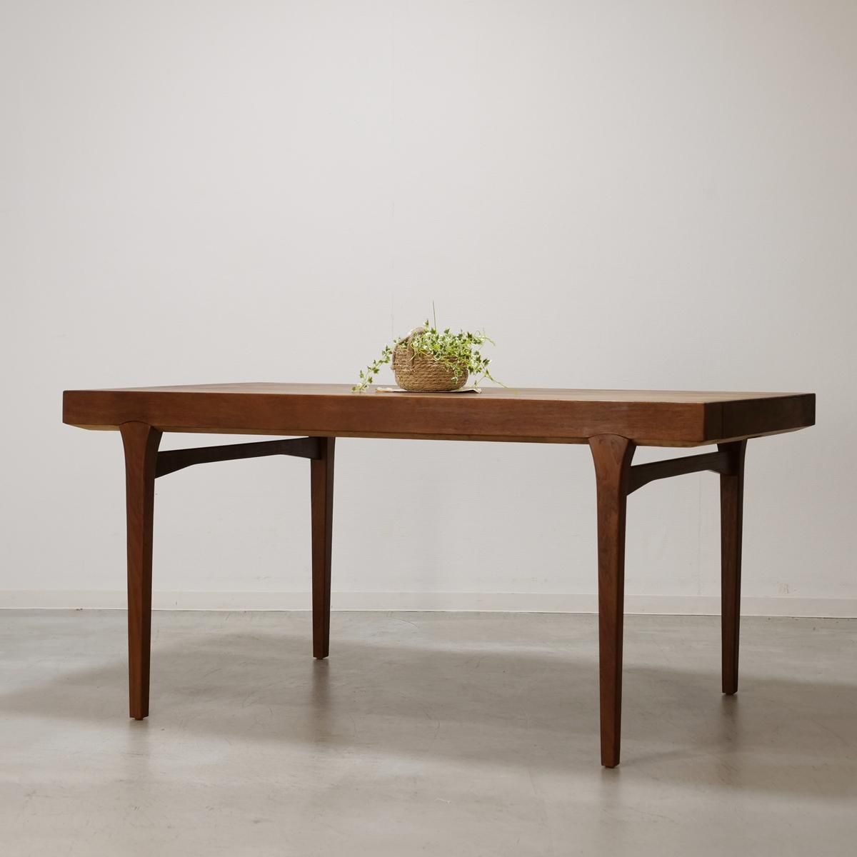 1970年代、デンマークで生まれた北欧ヴィンテージのダイニングテーブル。このテーブルの魅力は、何よりも印象的な脚周りのデザインです。天板を支える脚部には、曲線を描く補強材が美しく配され、構造美と機能美を見事に融合させています。まるで彫刻のように、力強くも繊細な表情を見せるフォルム。それは黄金期に培われた技術と美意識を受け継ぎながら、独自の進化を遂げた時代だからこそ生まれた家具としての完成度の高さを物語っています。