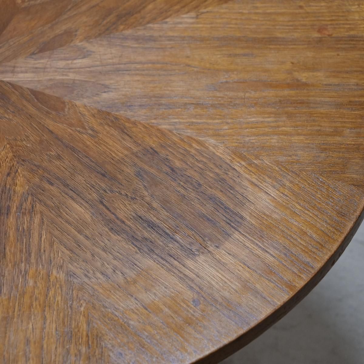 上質な「チーク材」の突板を、計算し尽くされた角度で丁寧に貼り合わせることで、万華鏡のような美しい放射状の模様(サンバースト)を描き出しています。