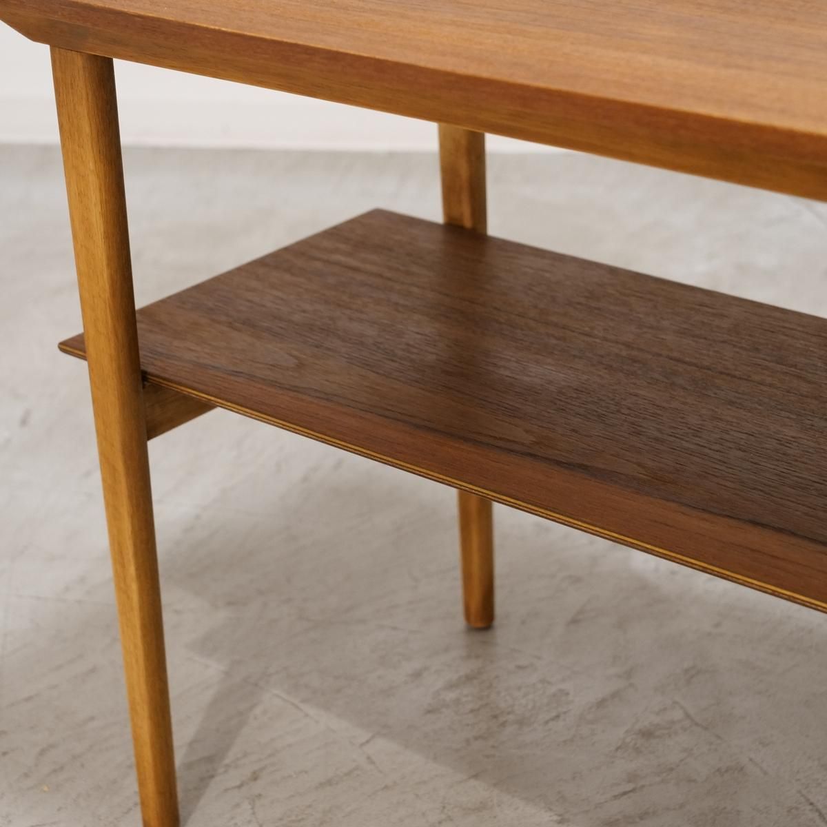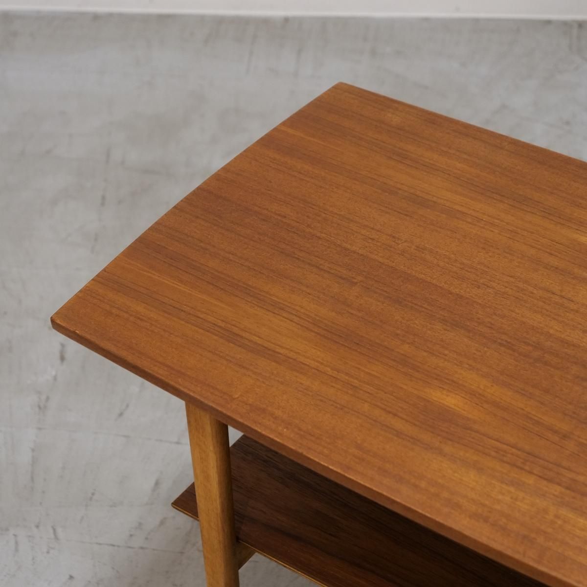 対して、脚に使われたビーチは、明るく素直な木目が特徴。チークの重厚さを、軽やかに支える。この対比が、視覚的な心地よさを生んでいる。下段の棚には雑誌を積んだり、小さな植物を置いたり。視線が落ちる場所に、さりげない景色をつくれるのがいい。