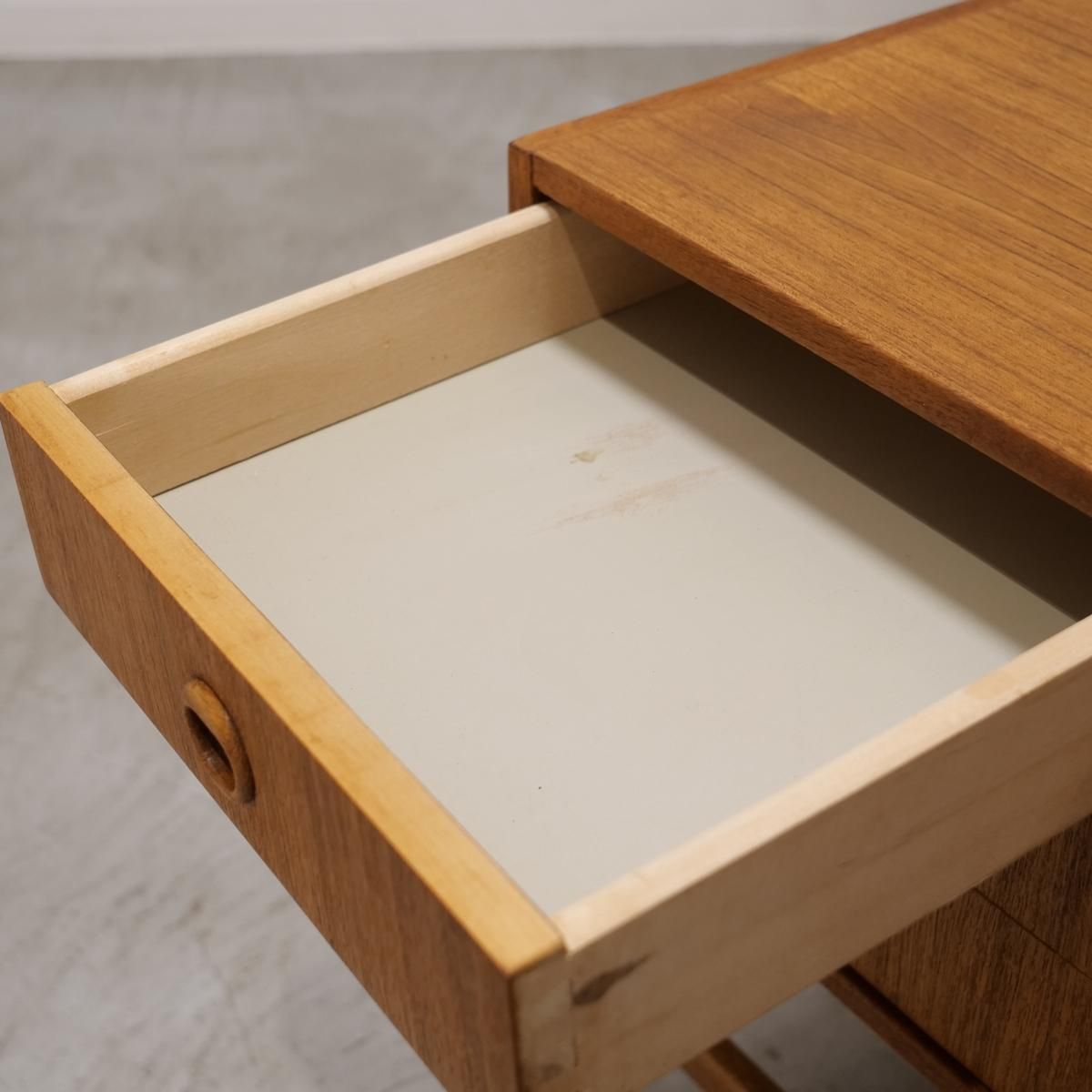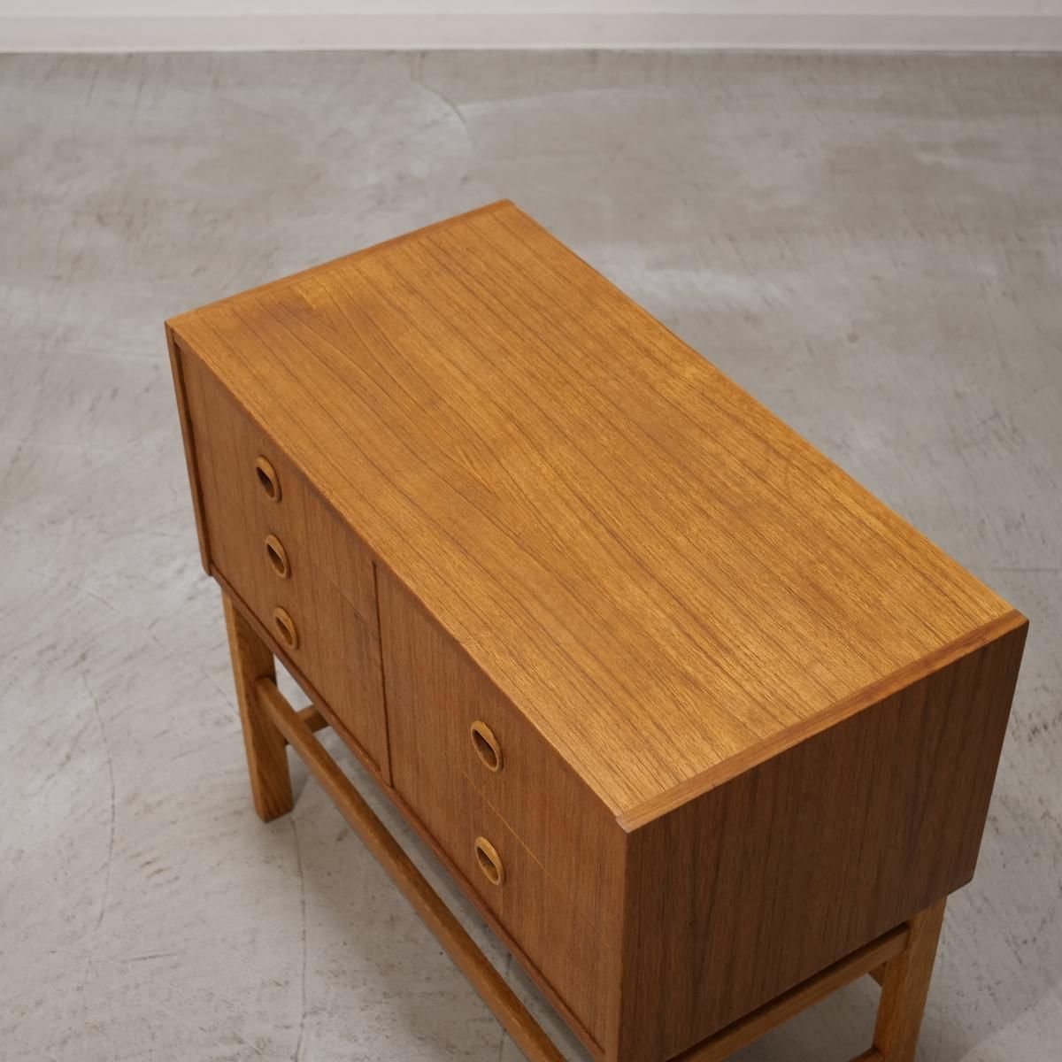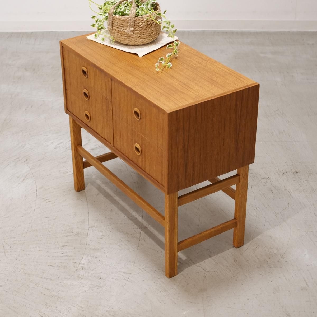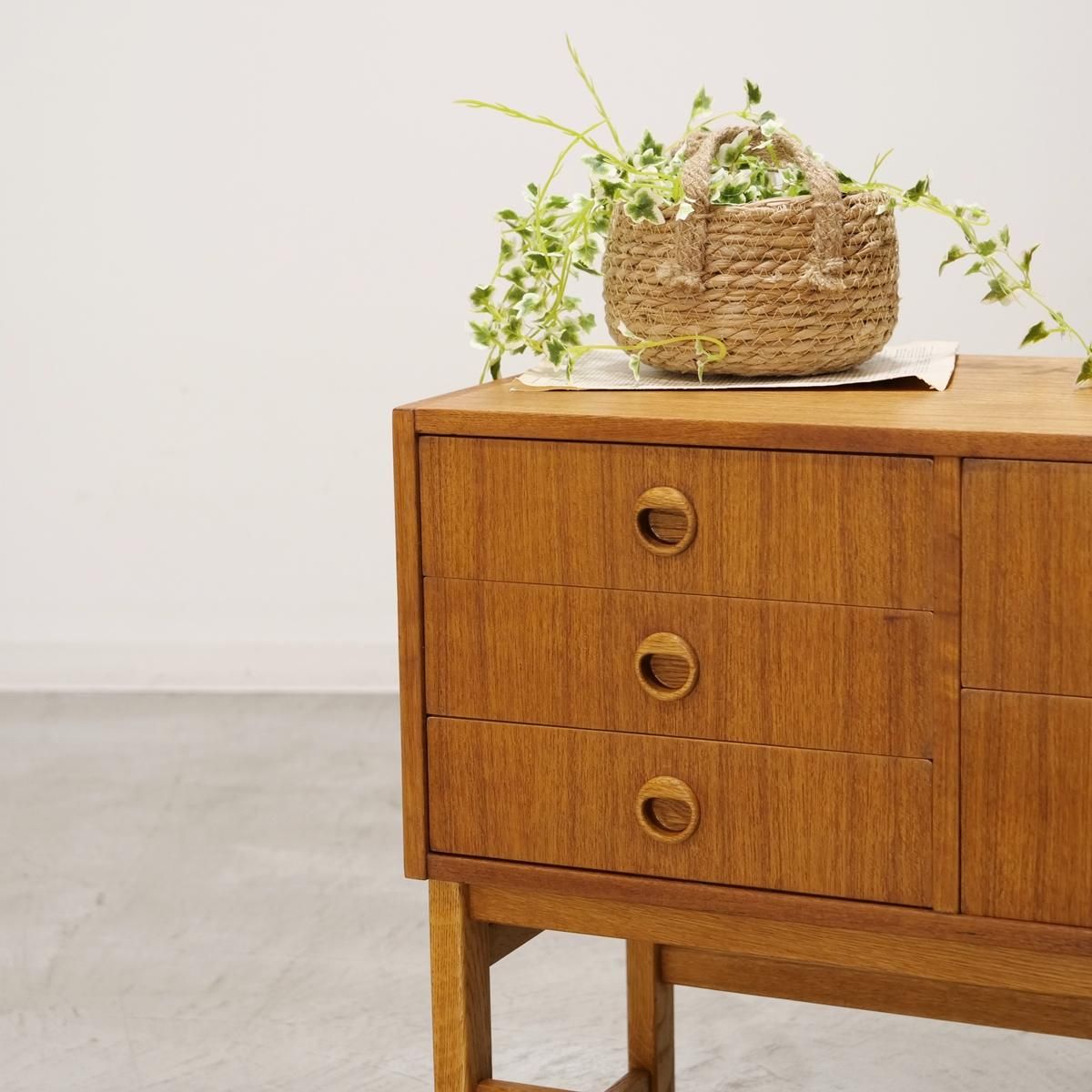 本体はチーク材、脚周りはオーク材。二つの木材の組み合わせが、視覚的なリズムを生んでいる。チークの重厚さを、オークの軽やかさが支える。この対比が、コンパクトな家具に奥行きを与えています。