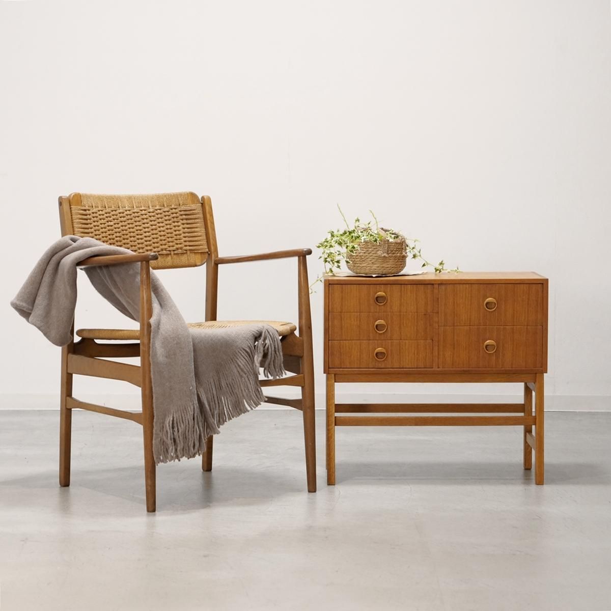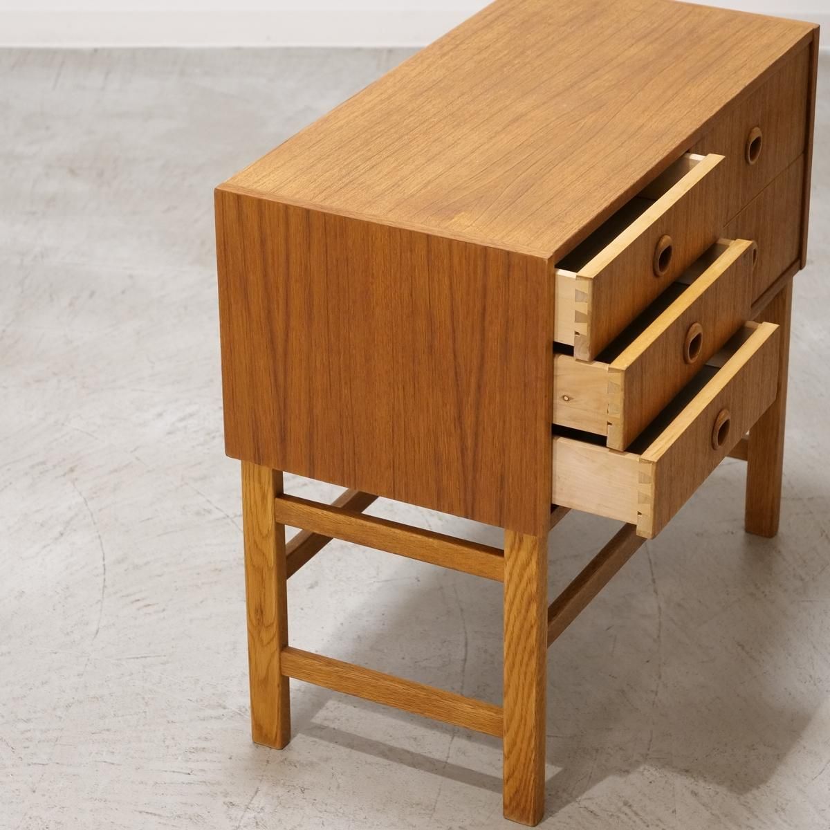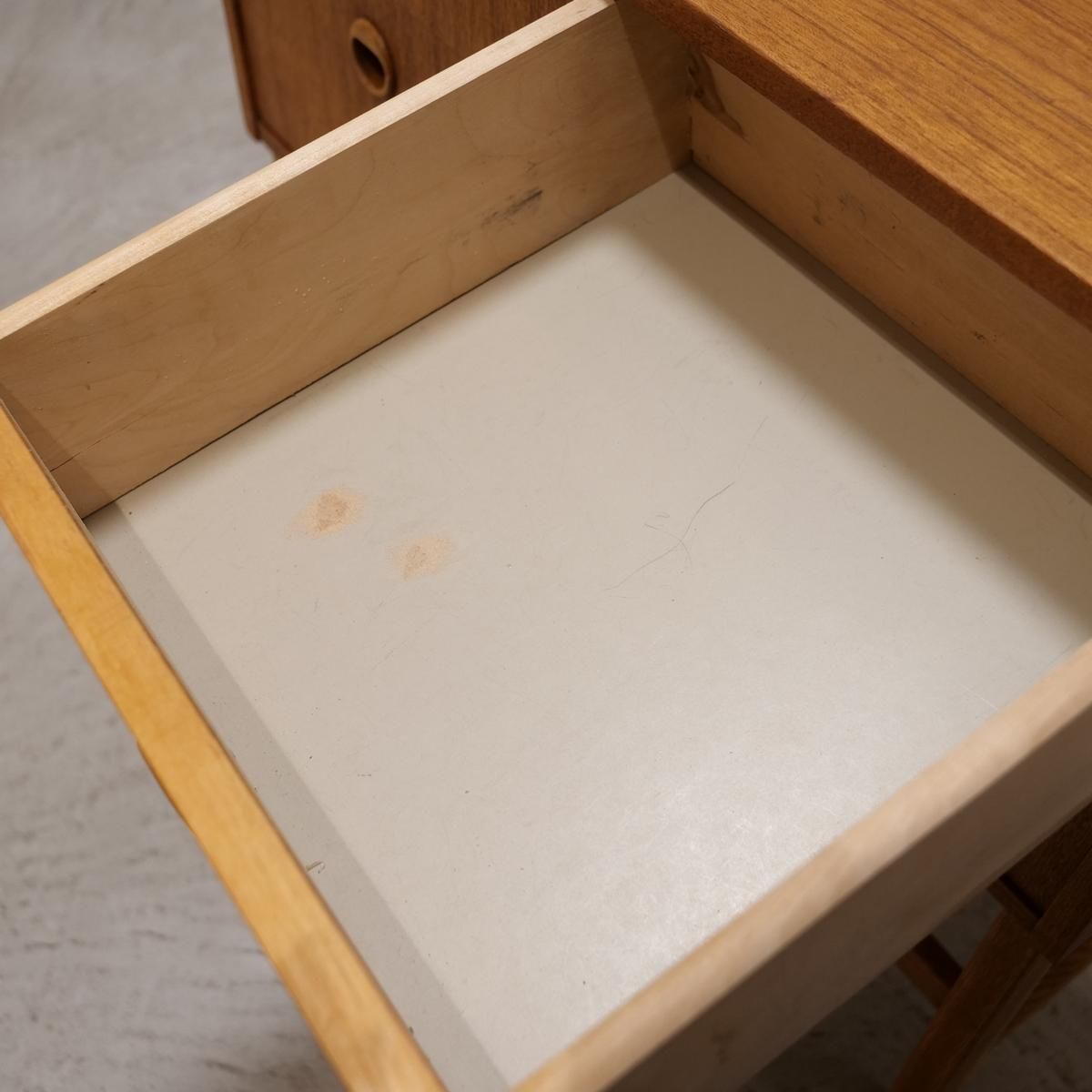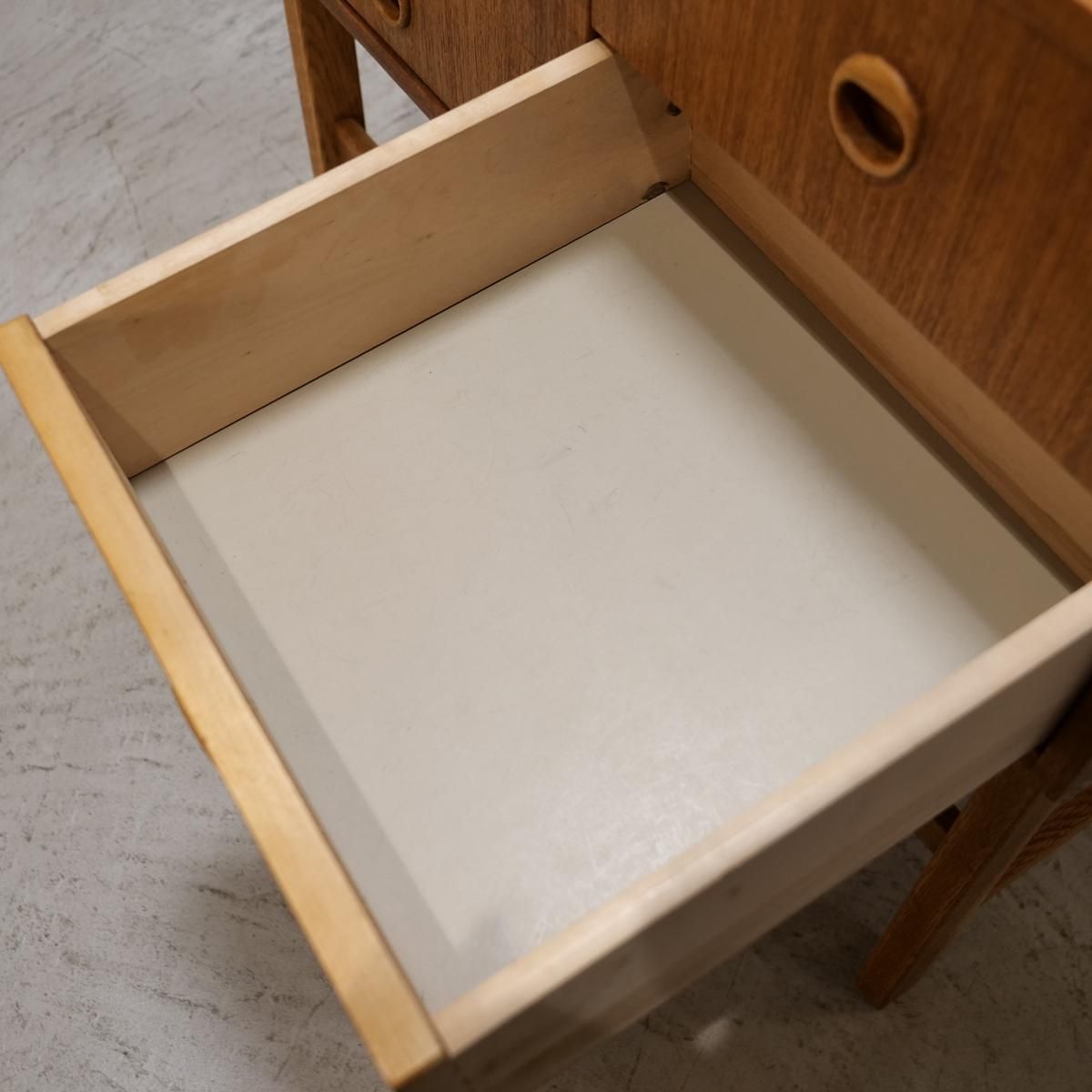 本体はチーク材、脚周りはオーク材。二つの木材の組み合わせが、視覚的なリズムを生んでいる。チークの重厚さを、オークの軽やかさが支える。この対比が、コンパクトな家具に奥行きを与えています。