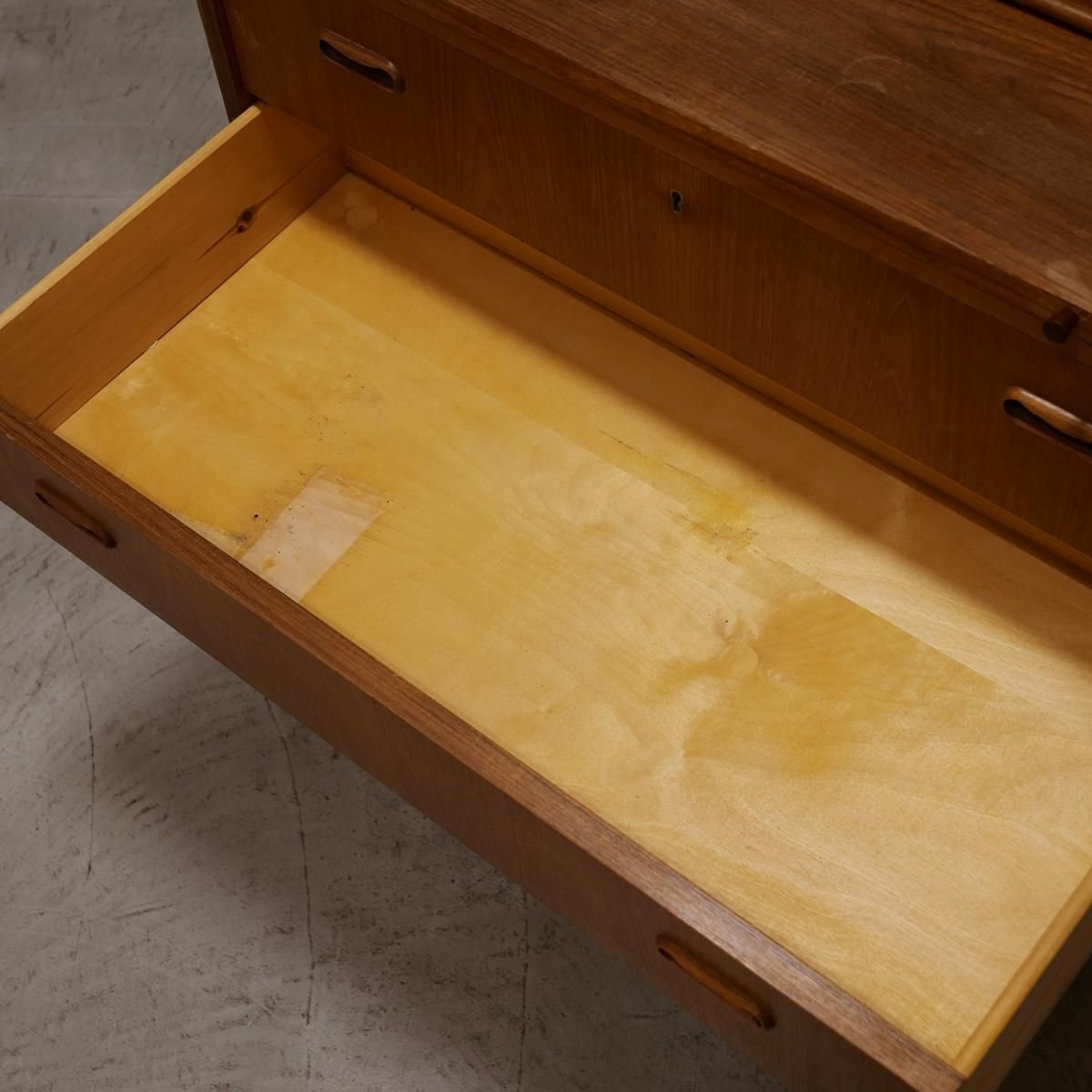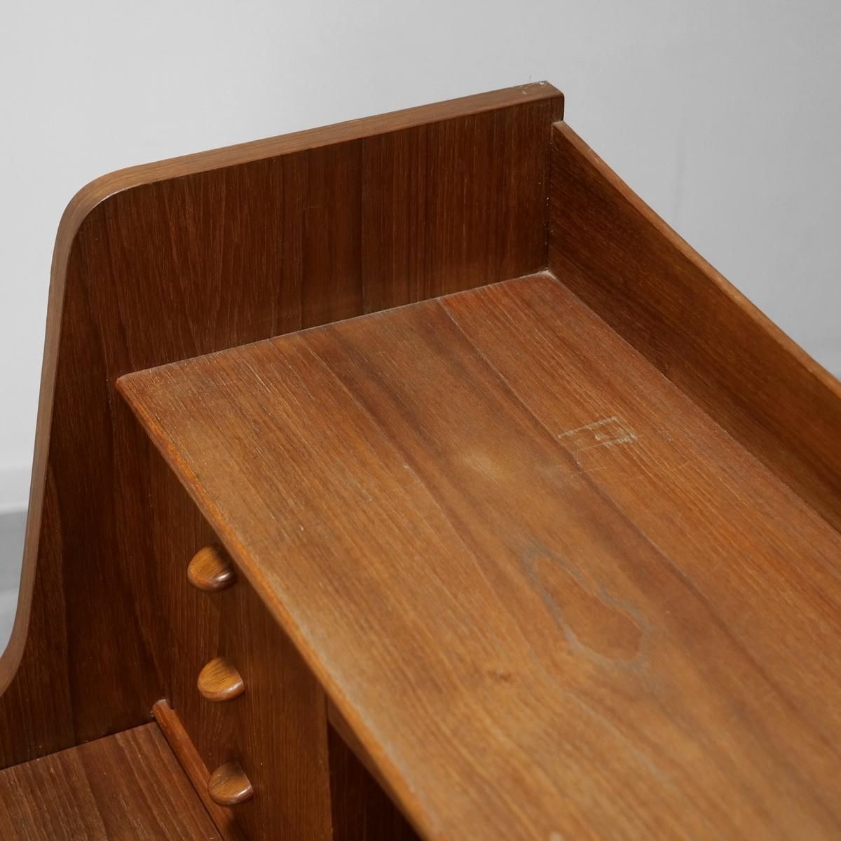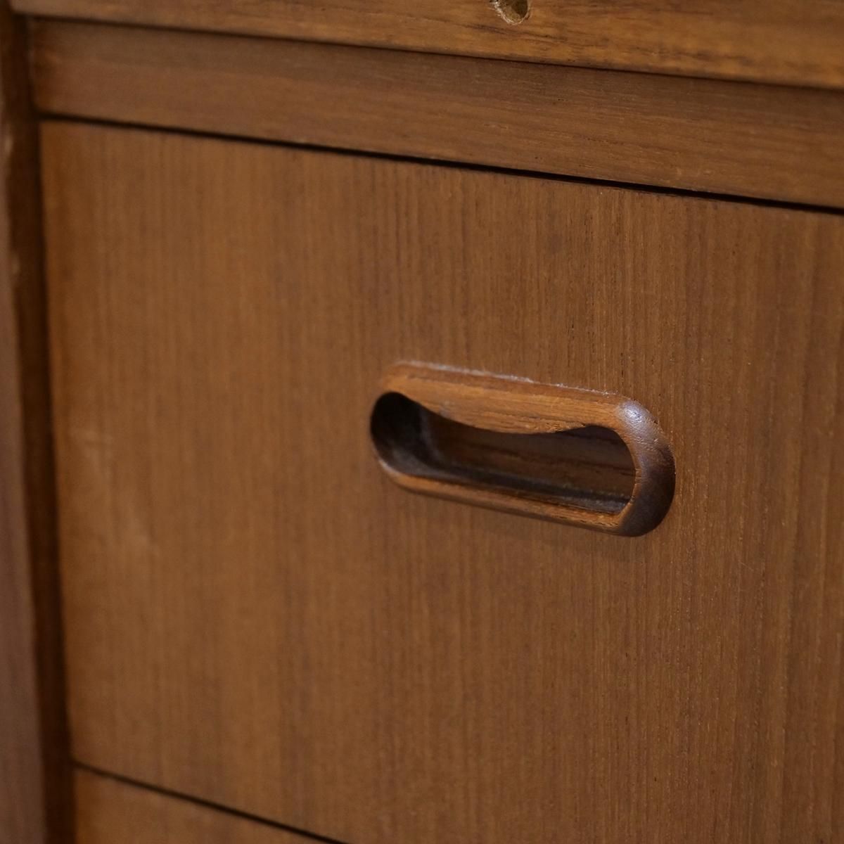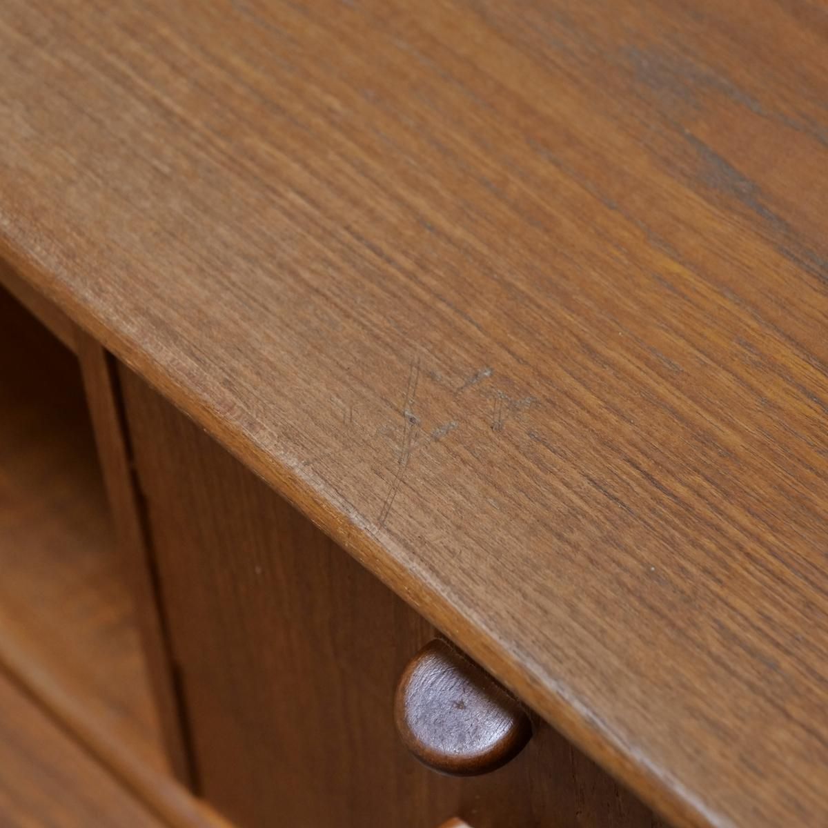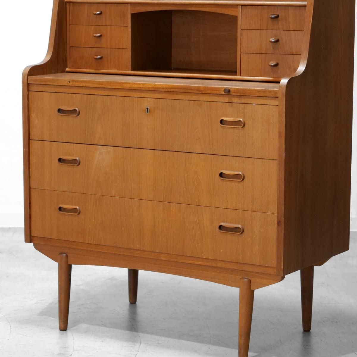 チーク材の飴色の木肌が、50年以上の時間を物語っている。この温もりある表情が、どんな部屋にも馴染み、空間にやわらかな風景をつくりだします。当店から、あなたのもとへ。この家具が、あなたの暮らしにどんな時間をもたらすのか。それは、これから始まる物語です。天板をスライドさせる音、引き出しを開ける手の感触、曲線に触れる指先の感覚。そんな小さな感覚が、毎日を豊かにしていく。