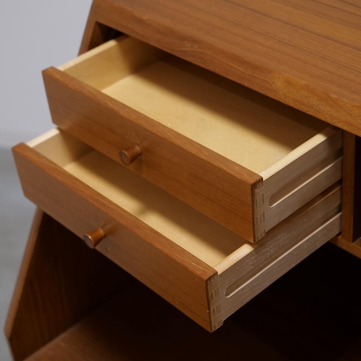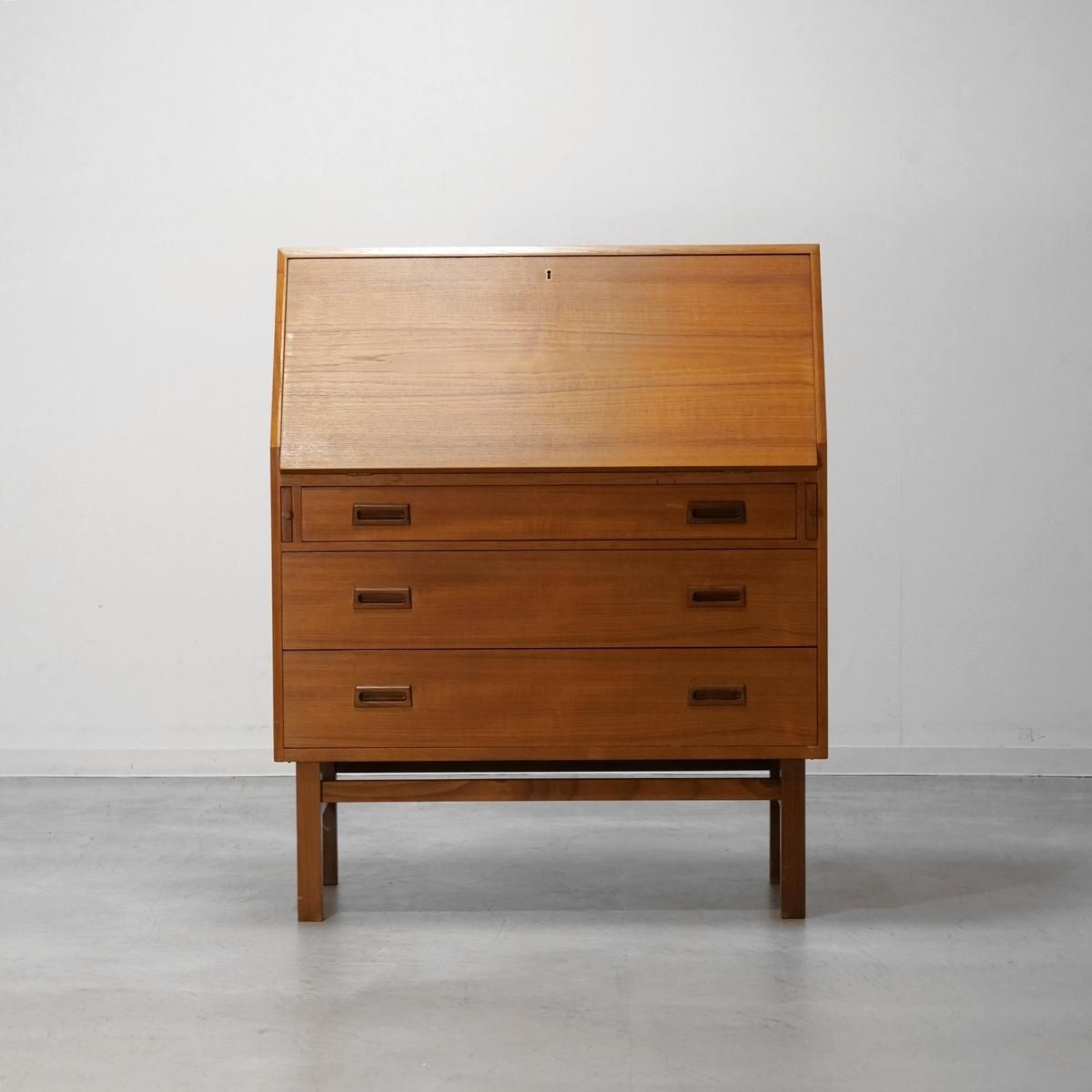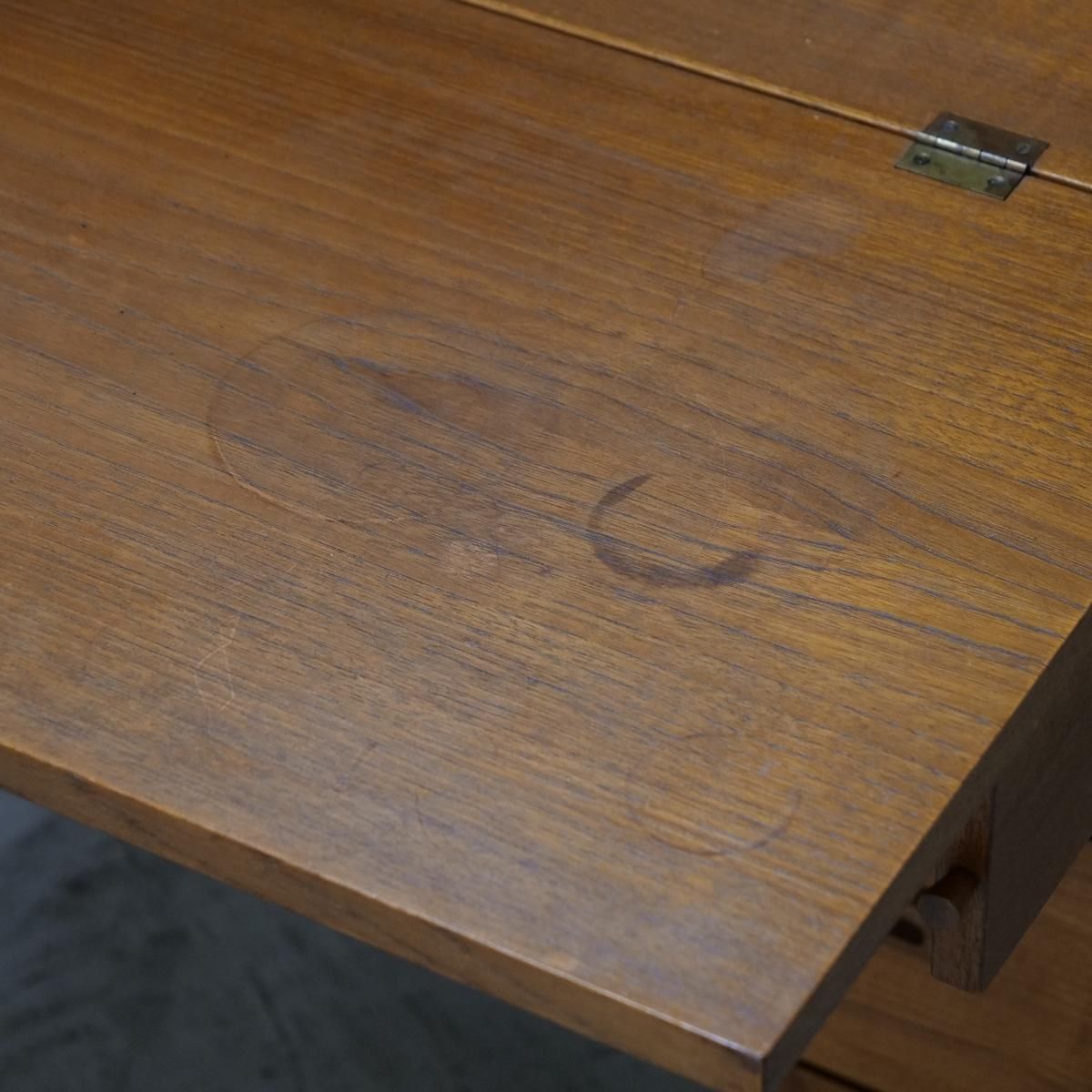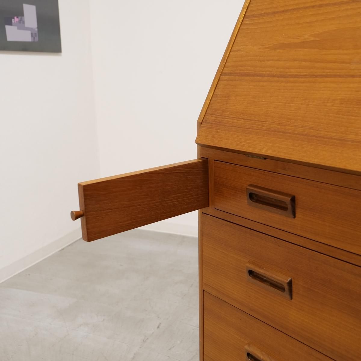 直線的でマニッシュなフォルムですが、冷たさを感じさせないのは、経年変化したチーク材が持つ温かみゆえ。天板を開けば、そこはあなただけの書斎に。閉じれば、木目の美しいチェストに。鍵穴に鍵を差し込み、「カチャッ」と回すその感触さえも、デジタルな現代においては特別な儀式のように感じられます。