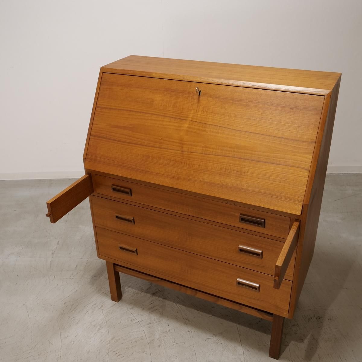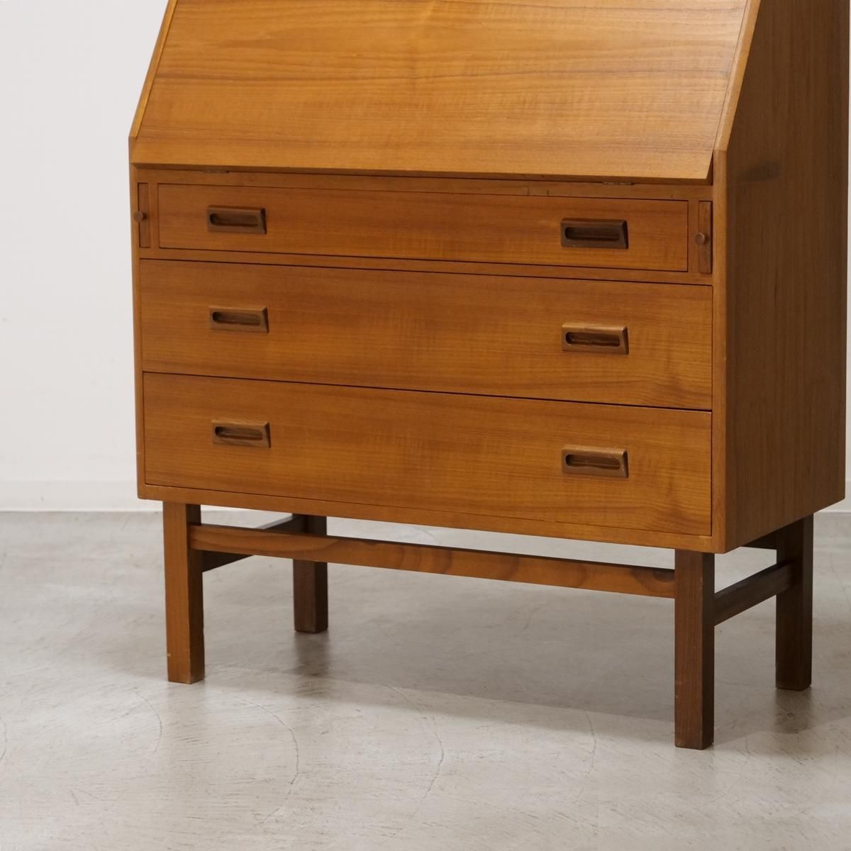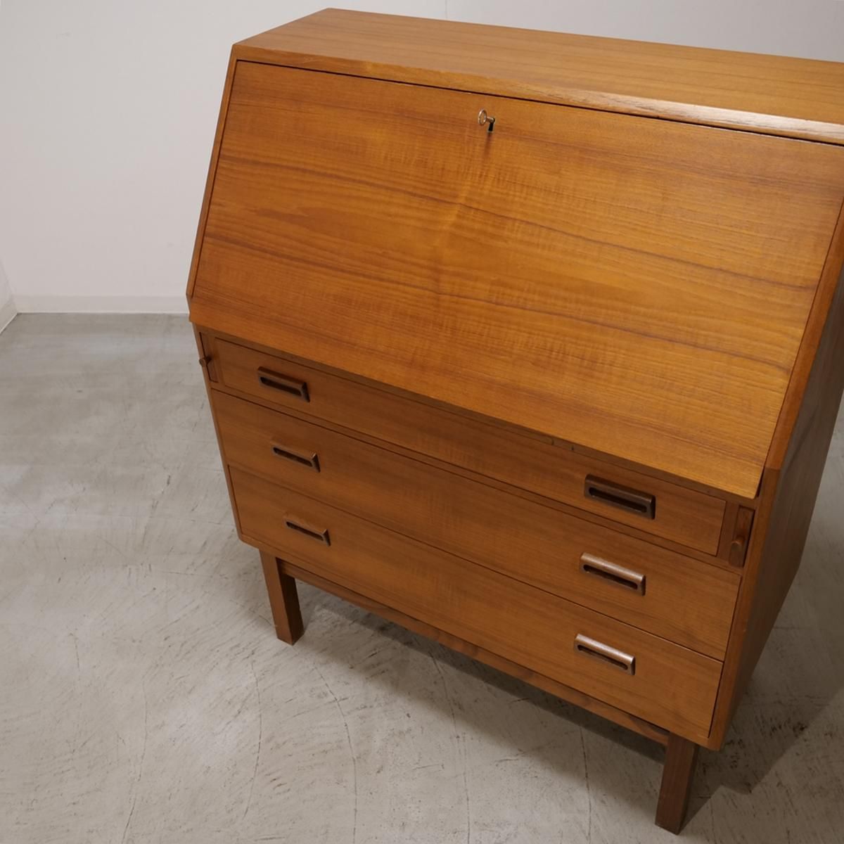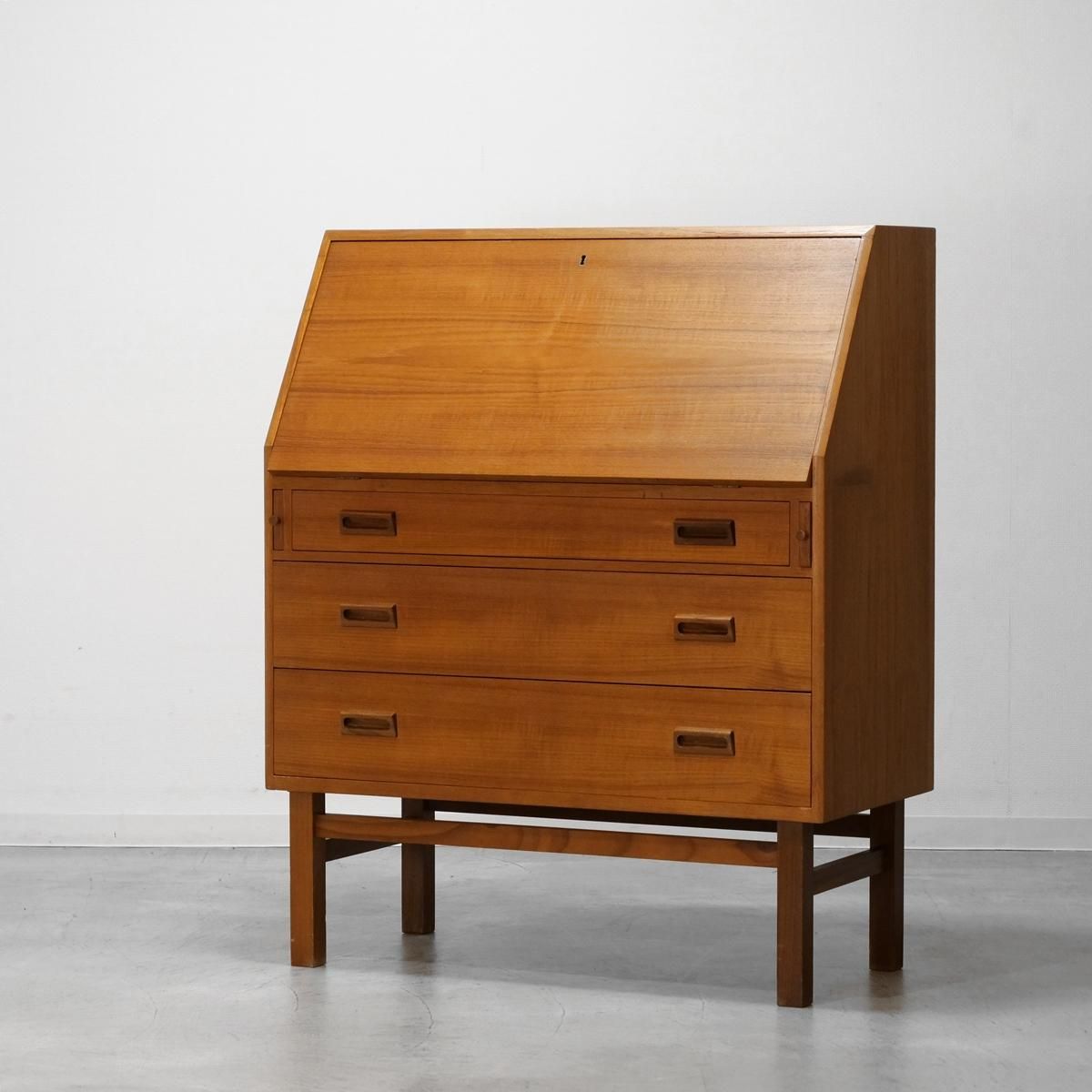 直線的でマニッシュなフォルムですが、冷たさを感じさせないのは、経年変化したチーク材が持つ温かみゆえ。天板を開けば、そこはあなただけの書斎に。閉じれば、木目の美しいチェストに。鍵穴に鍵を差し込み、「カチャッ」と回すその感触さえも、デジタルな現代においては特別な儀式のように感じられます。
