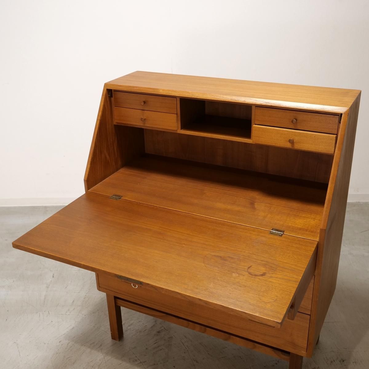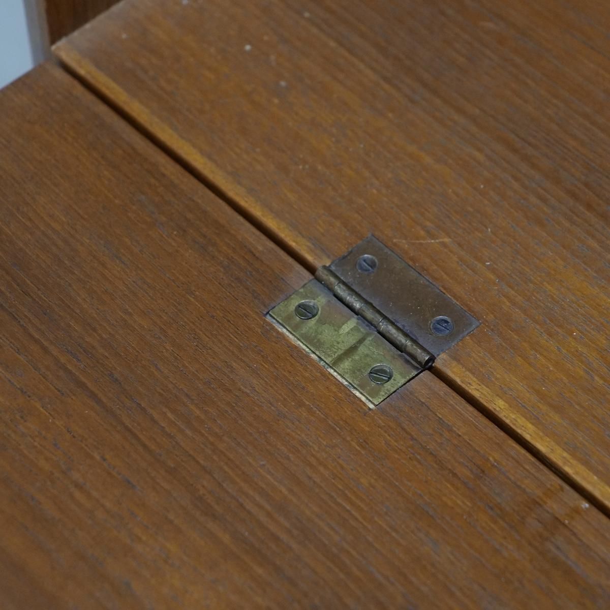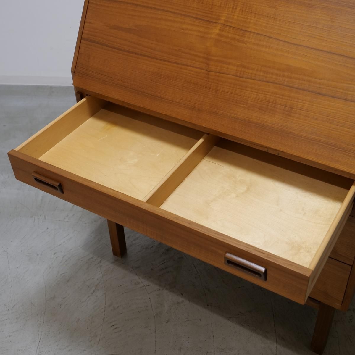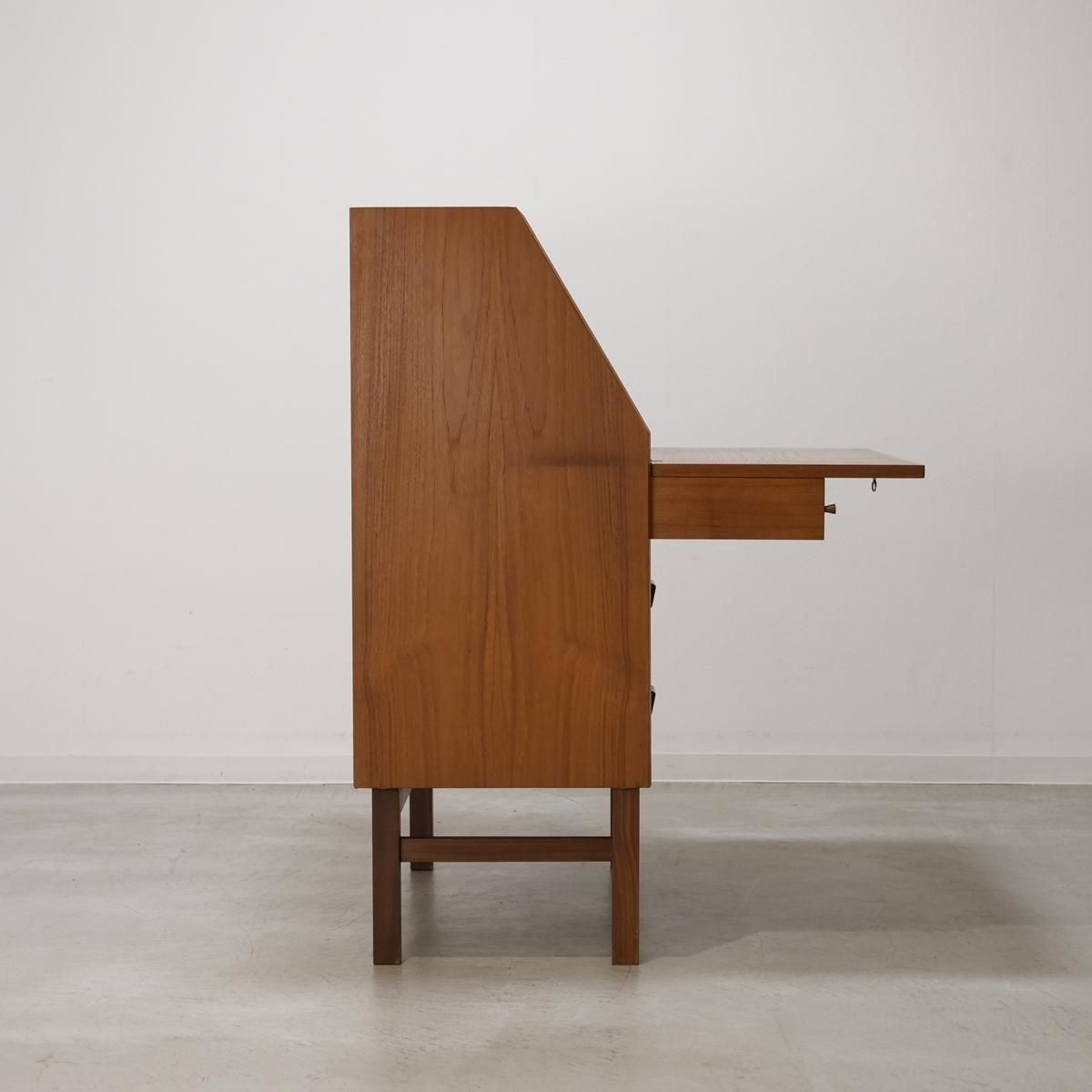 直線的でマニッシュなフォルムですが、冷たさを感じさせないのは、経年変化したチーク材が持つ温かみゆえ。天板を開けば、そこはあなただけの書斎に。閉じれば、木目の美しいチェストに。鍵穴に鍵を差し込み、「カチャッ」と回すその感触さえも、デジタルな現代においては特別な儀式のように感じられます。
