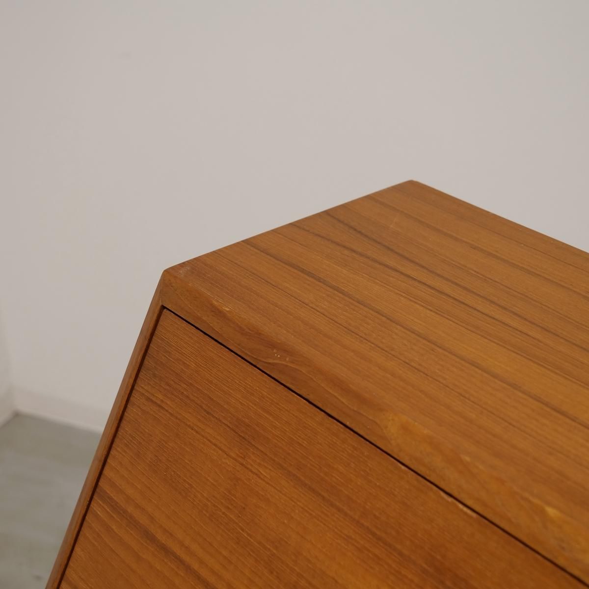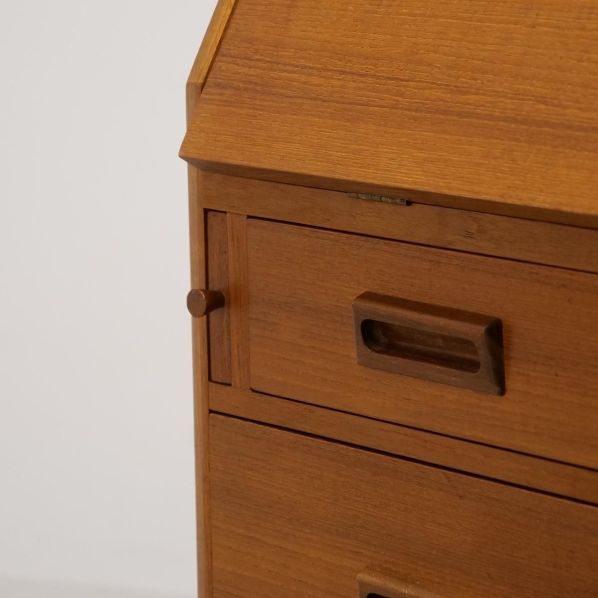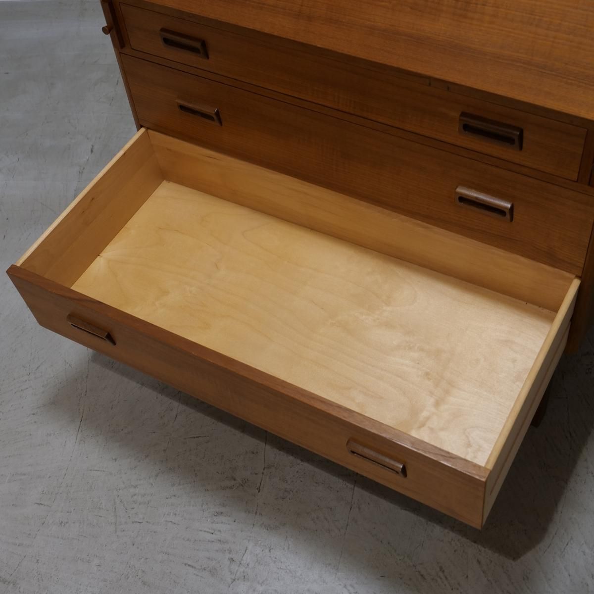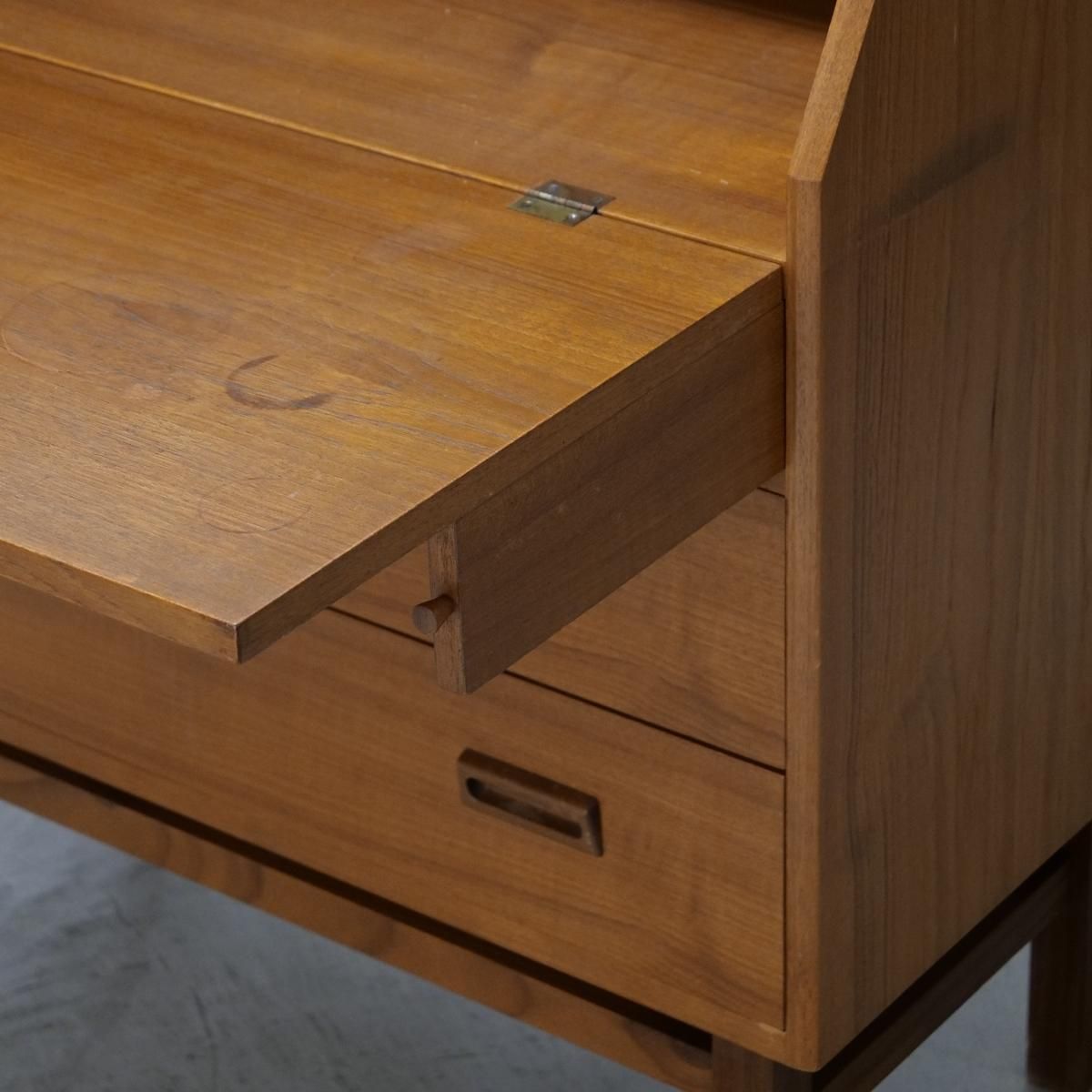 直線的でマニッシュなフォルムですが、冷たさを感じさせないのは、経年変化したチーク材が持つ温かみゆえ。天板を開けば、そこはあなただけの書斎に。閉じれば、木目の美しいチェストに。鍵穴に鍵を差し込み、「カチャッ」と回すその感触さえも、デジタルな現代においては特別な儀式のように感じられます。