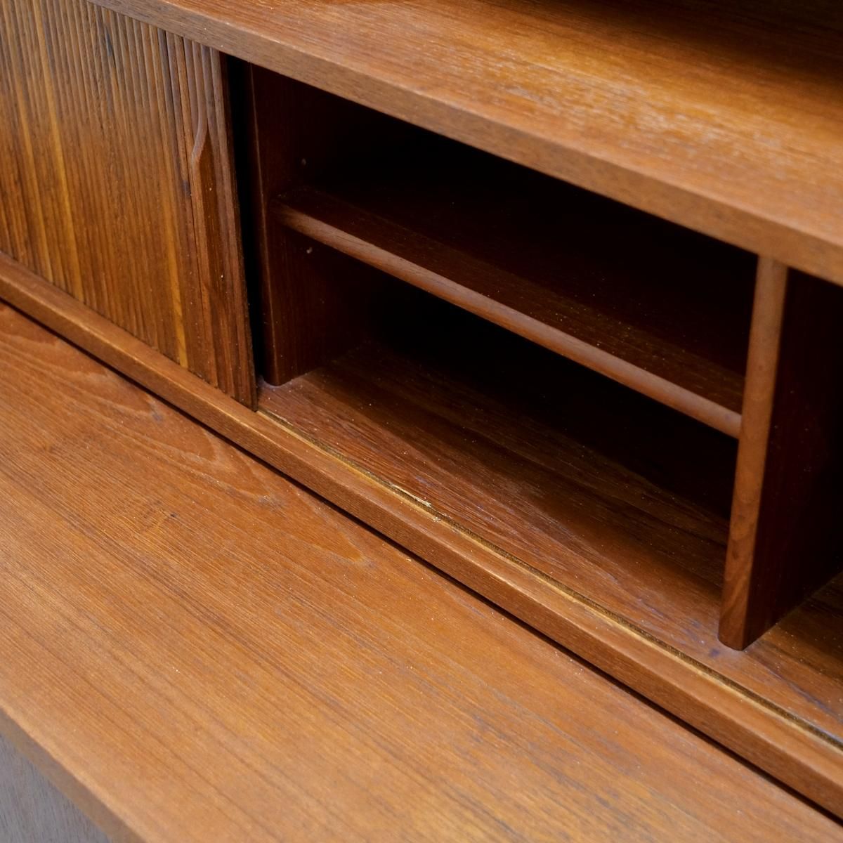 上段に向かうにつれて奥行きが浅くなるステップ状の構成。さらに、棚板の木口(断面)には鋭角なエッジ加工が施され、チークの厚みを感じさせないほどシャープなラインを描いています。
