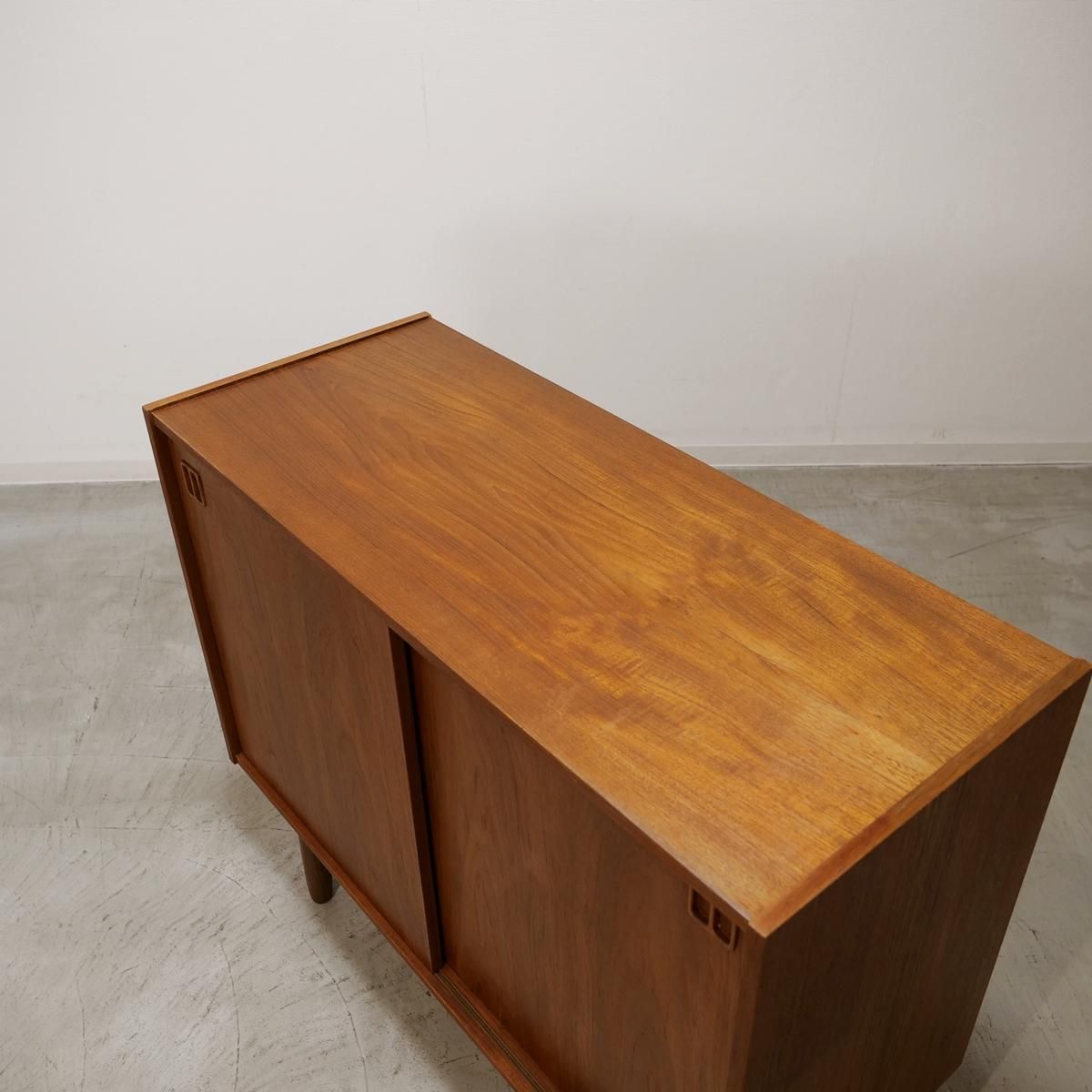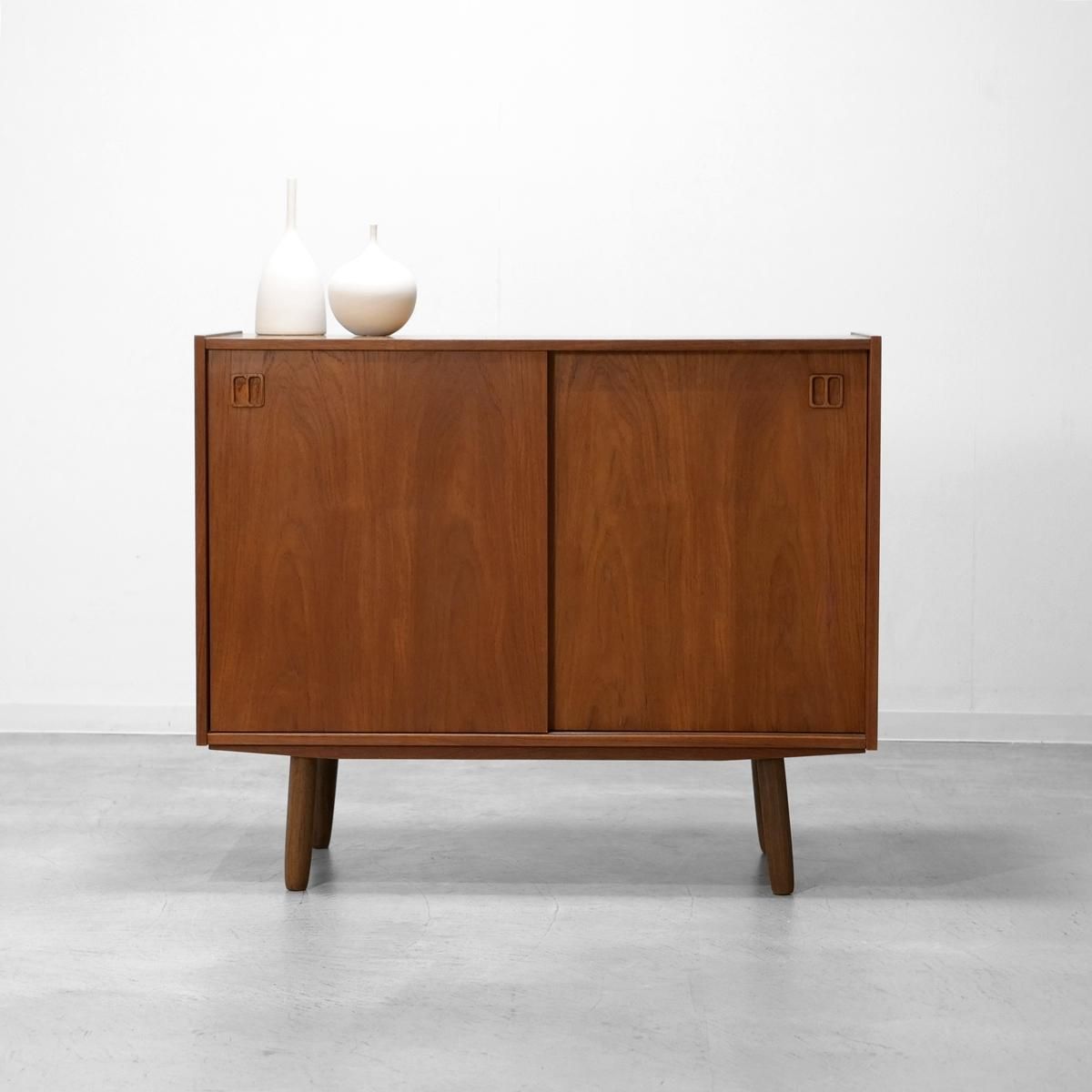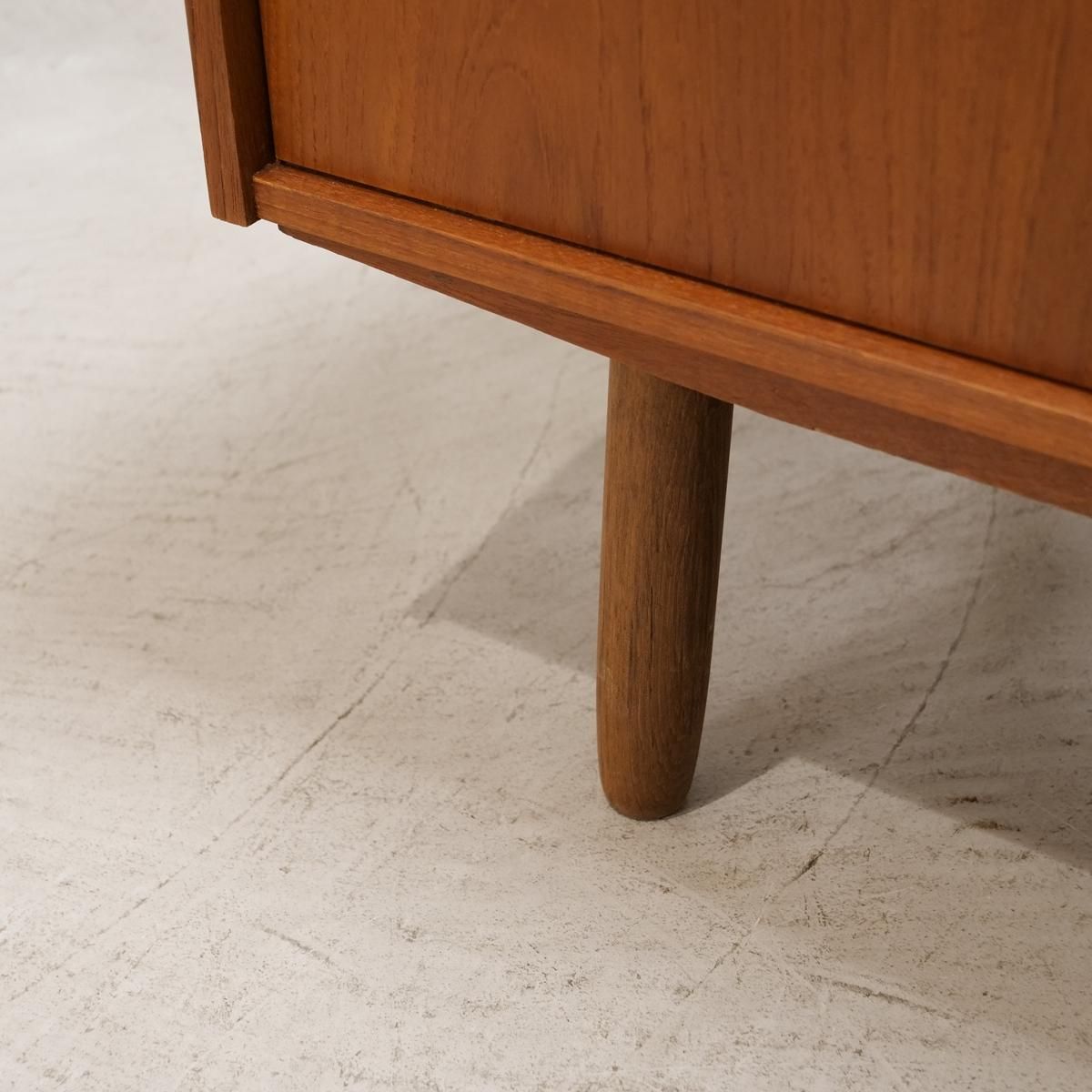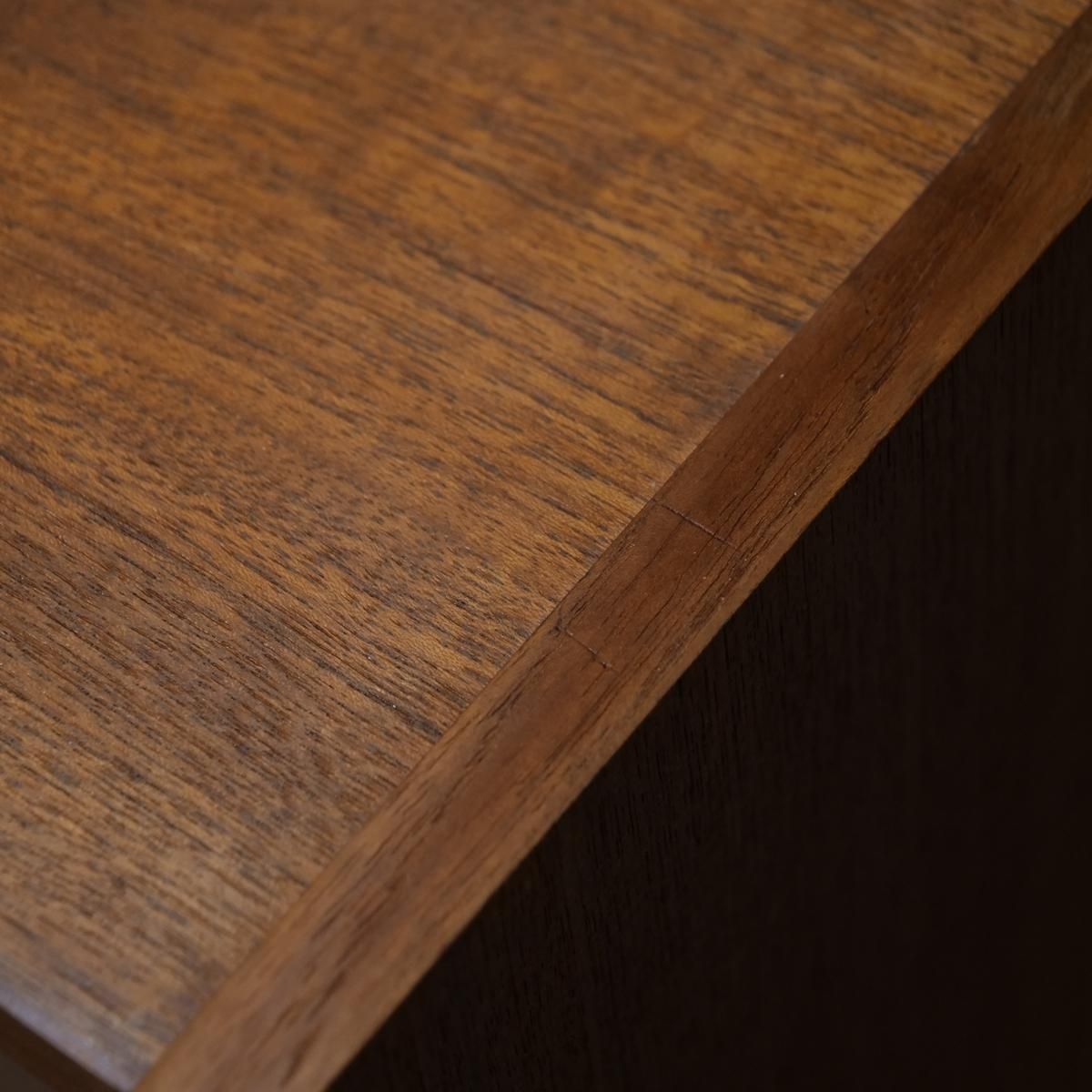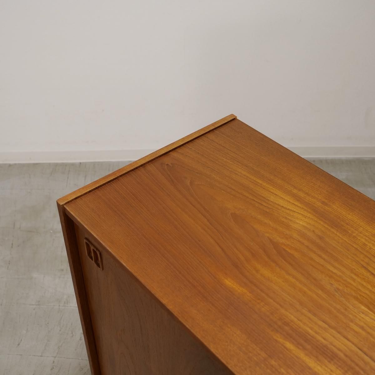 部屋の片隅に、静かに佇む大きな木の箱。 デンマークから届いたのは、深みのある「チーク材」の本体を、シックな「ウォールナット材」の脚が支える、美しいツートーンのキャビネット。