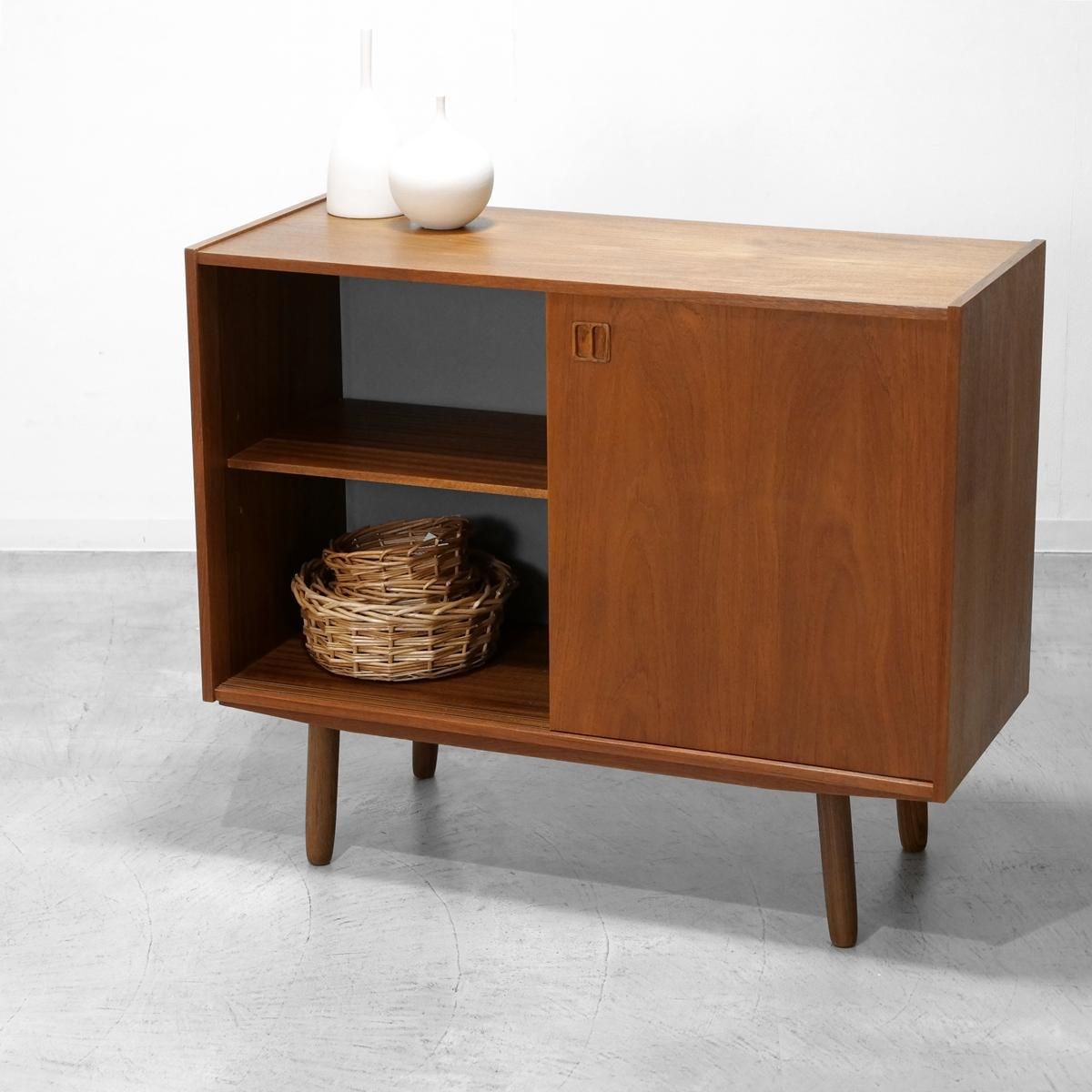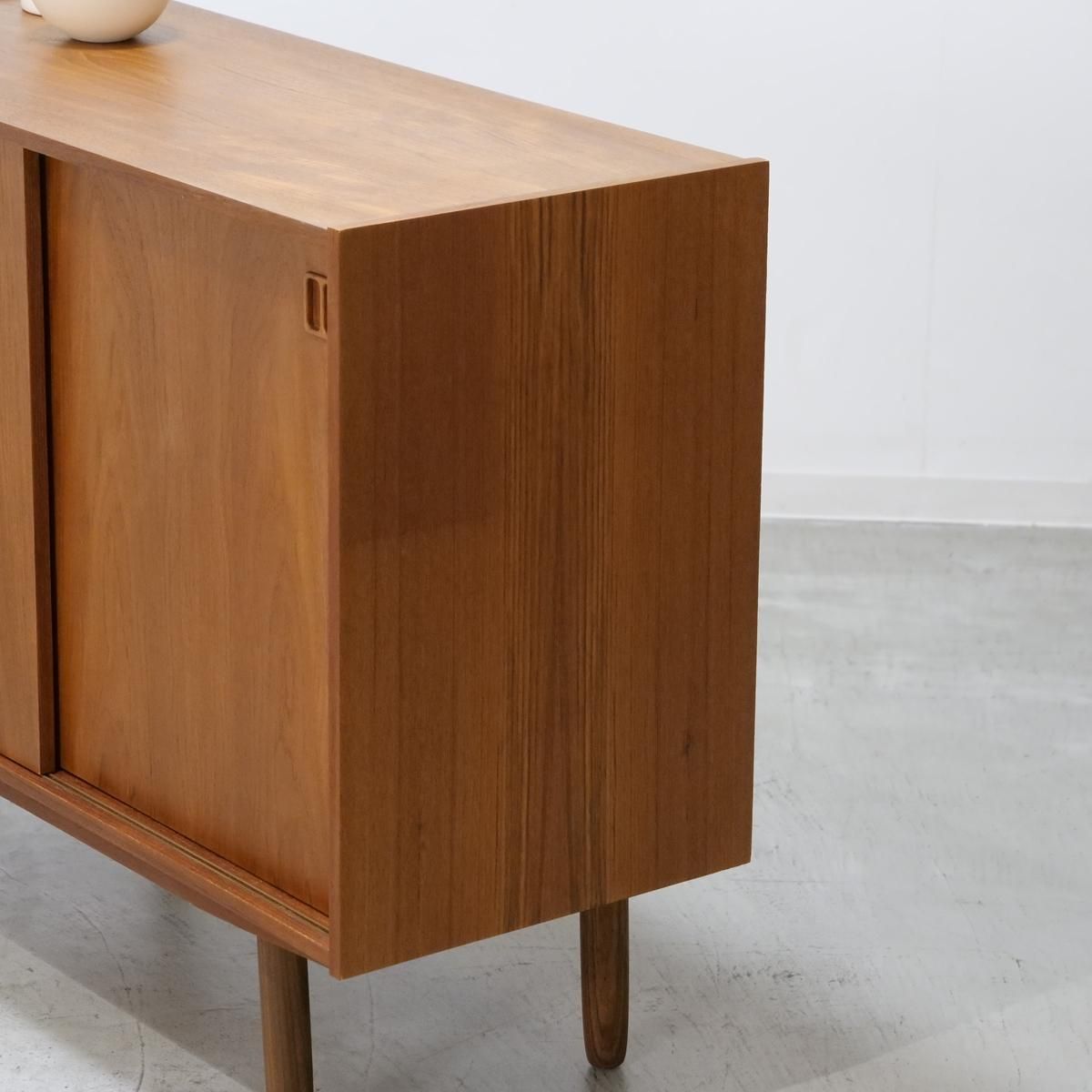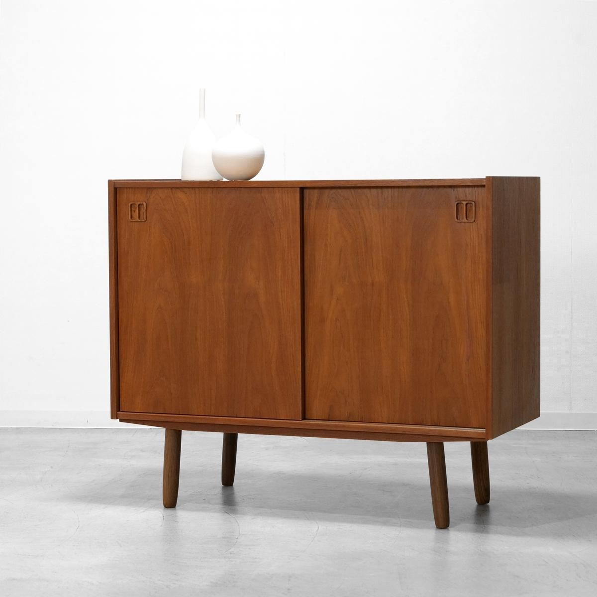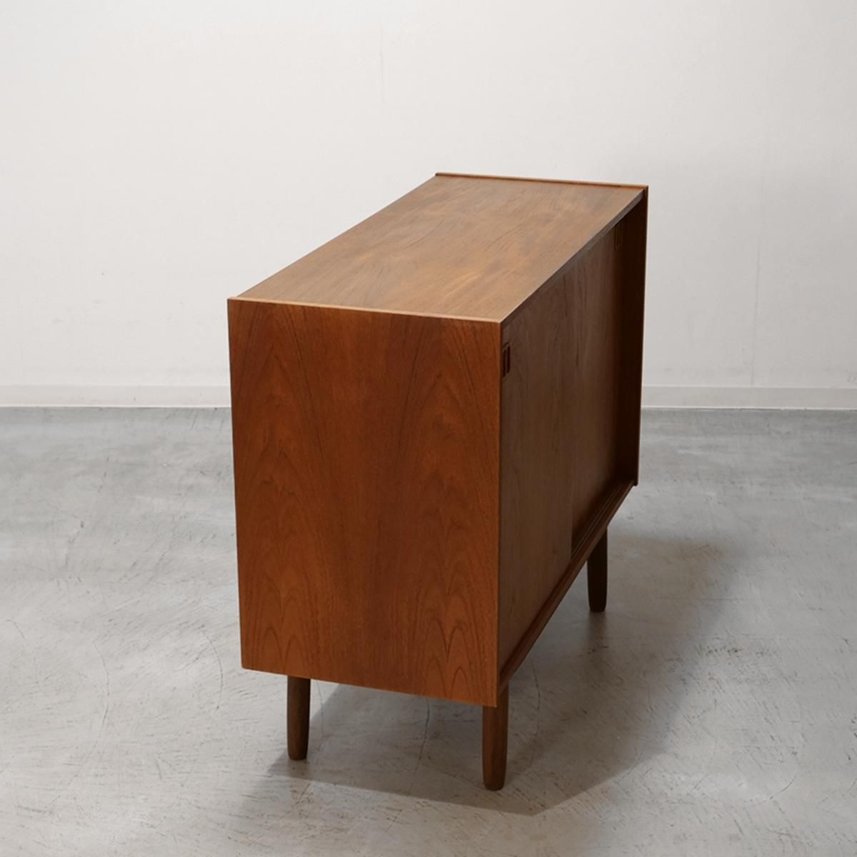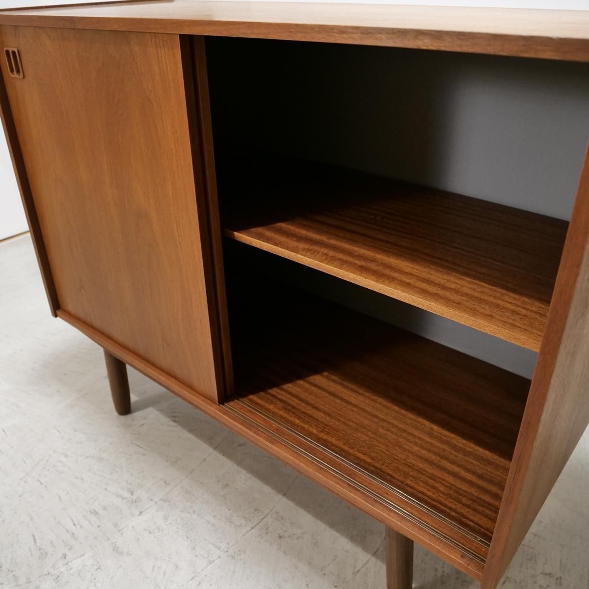 部屋の片隅に、静かに佇む大きな木の箱。 デンマークから届いたのは、深みのある「チーク材」の本体を、シックな「ウォールナット材」の脚が支える、美しいツートーンのキャビネット。