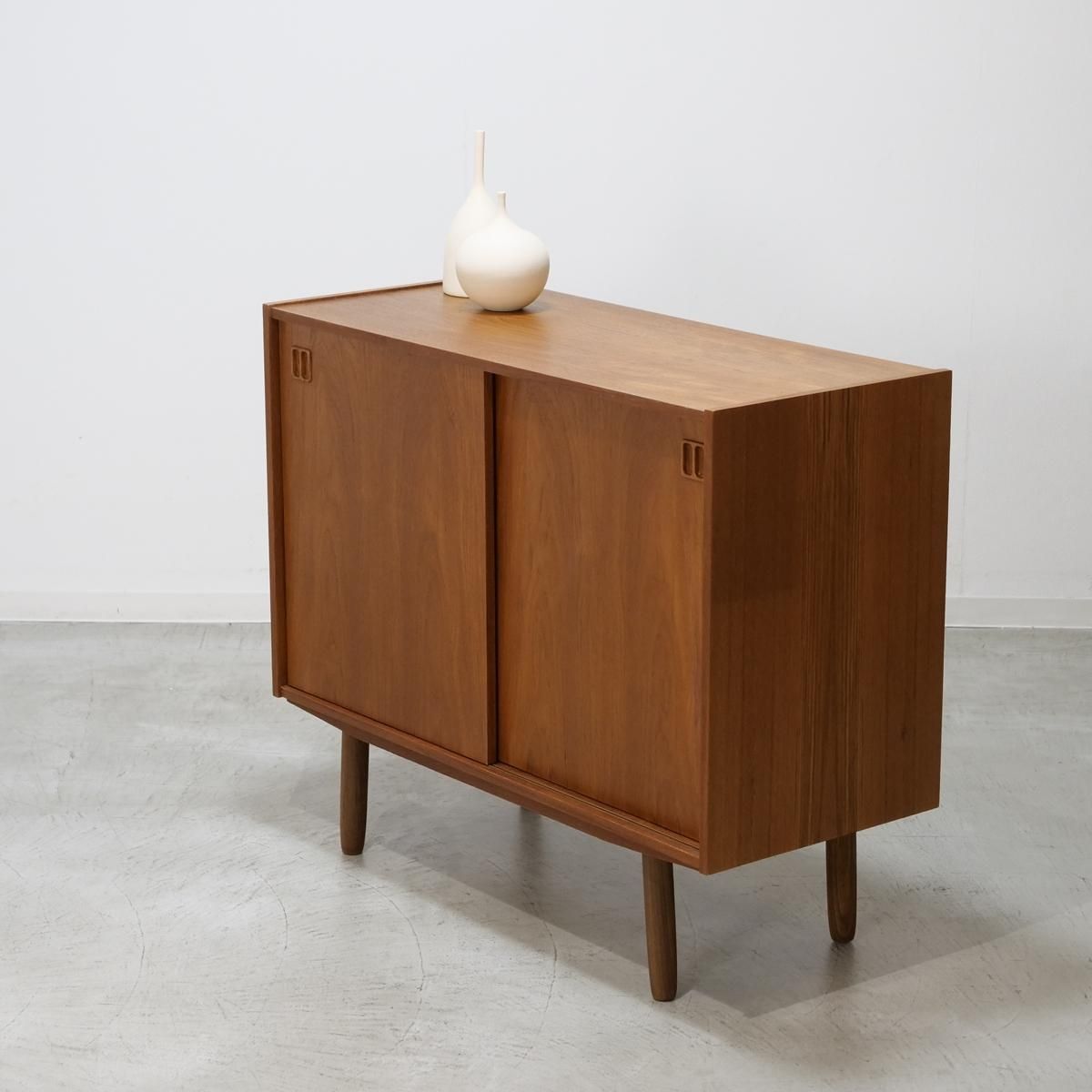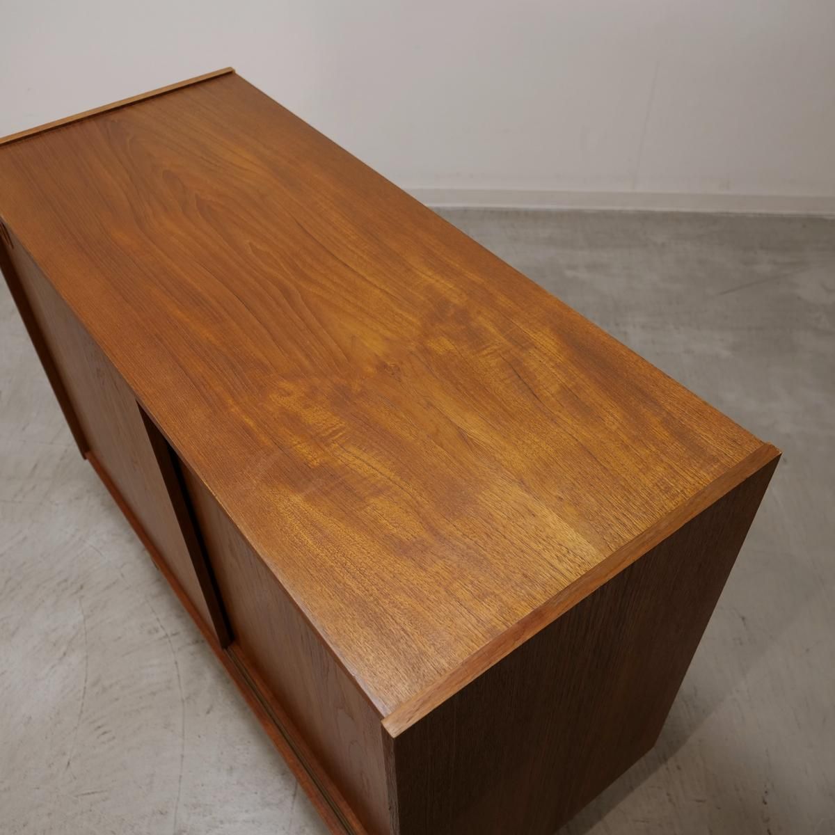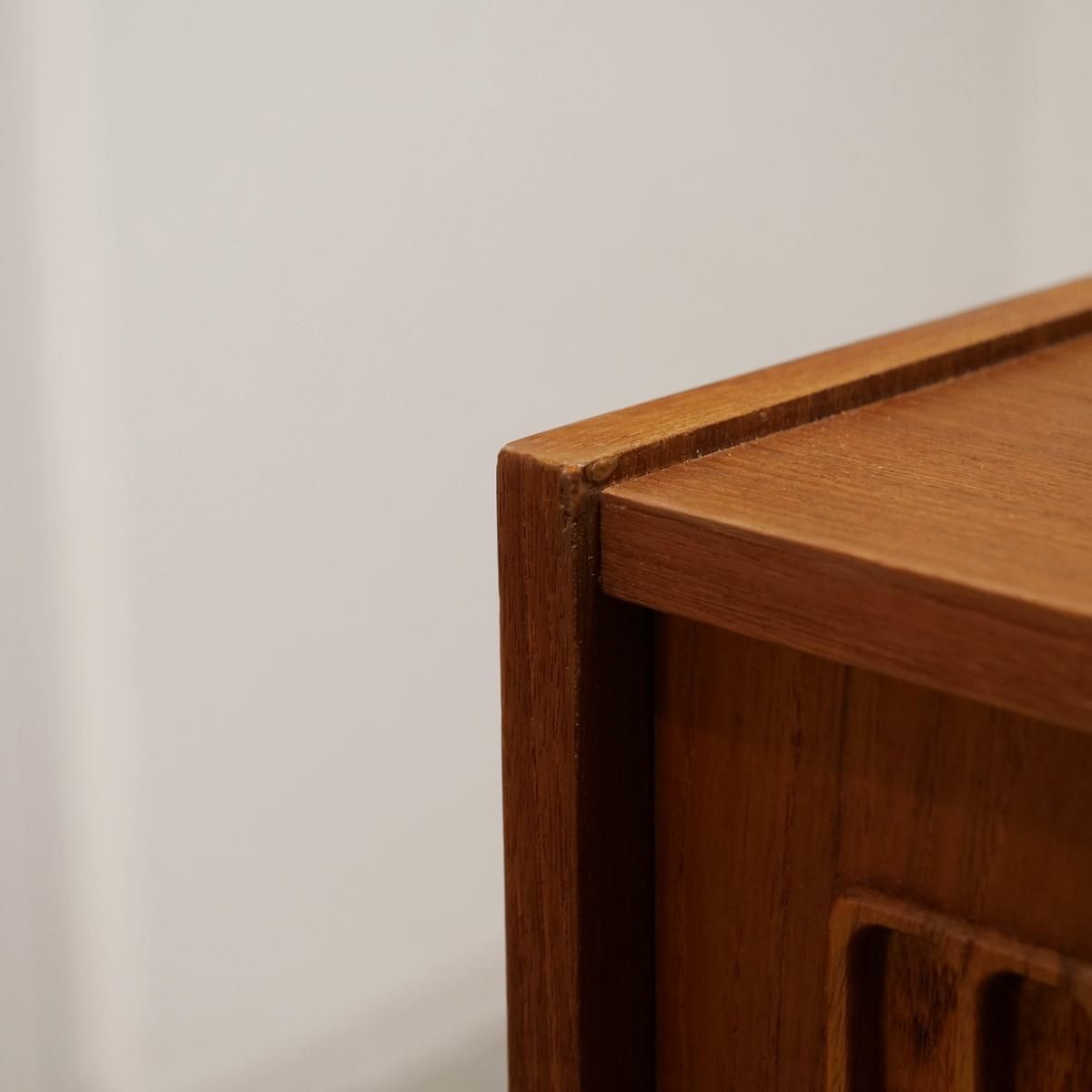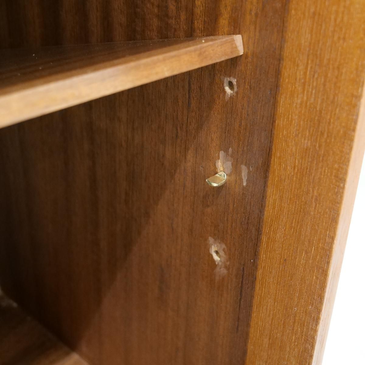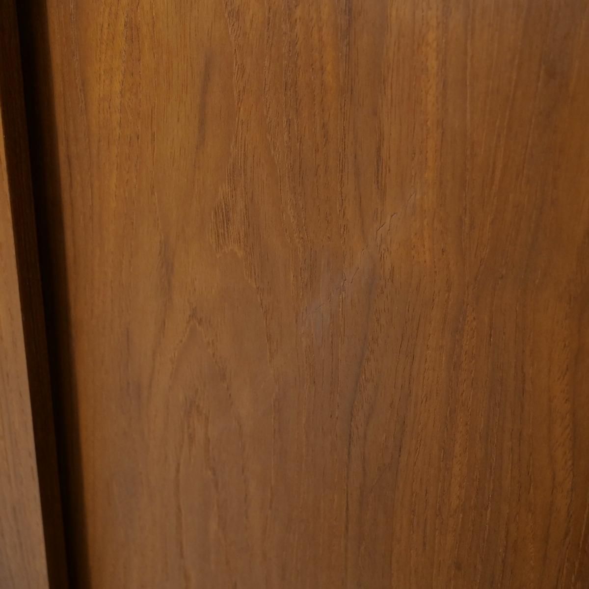 部屋の片隅に、静かに佇む大きな木の箱。 デンマークから届いたのは、深みのある「チーク材」の本体を、シックな「ウォールナット材」の脚が支える、美しいツートーンのキャビネット。